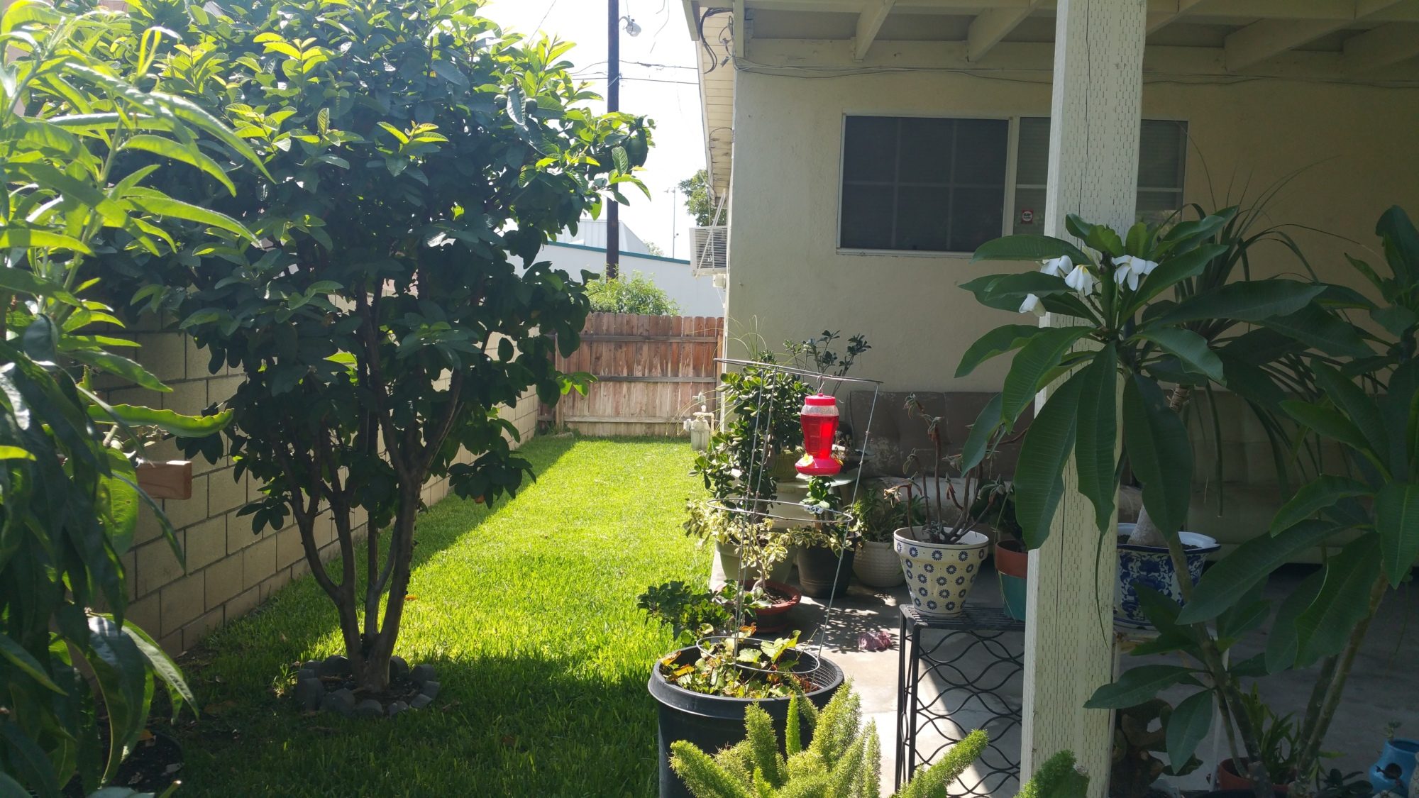 A quarter of our patio with leather couches that can easily be cleaned off. Our whole backyard is fenced in by 6 foot walls!! I am really worried about the plants on the patio though. My mom loves her plants! That is also a guava tree!