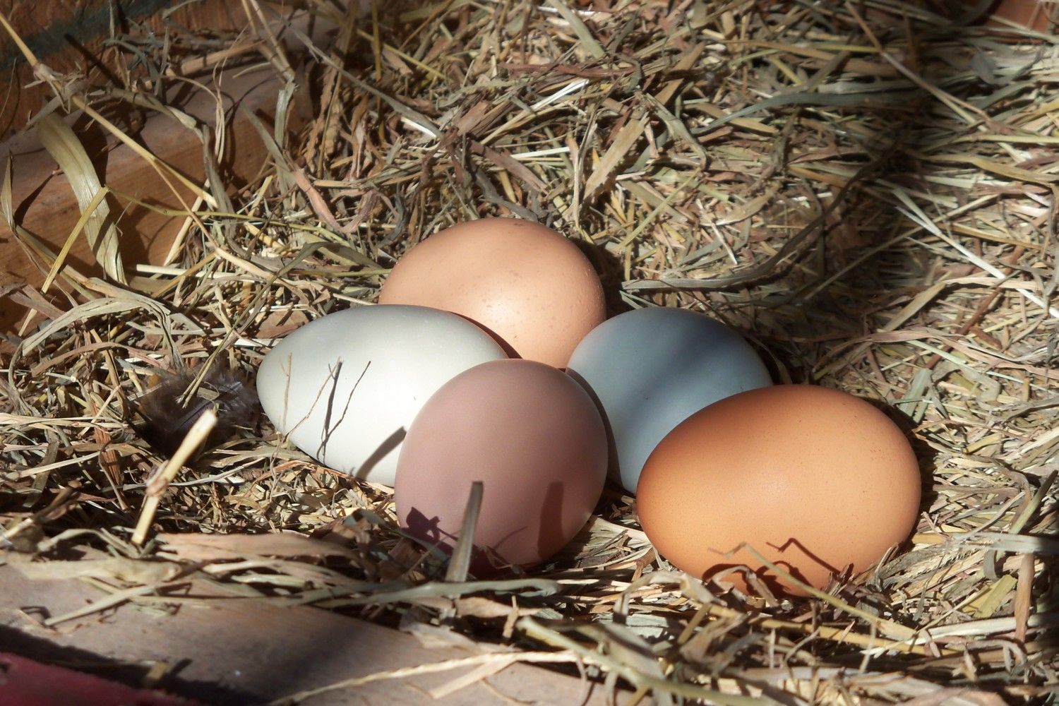 The black hen lays the green one on the left. The light brown/partridge pattern hen lays the blue on the right. The other mutt lays the pink one in front.