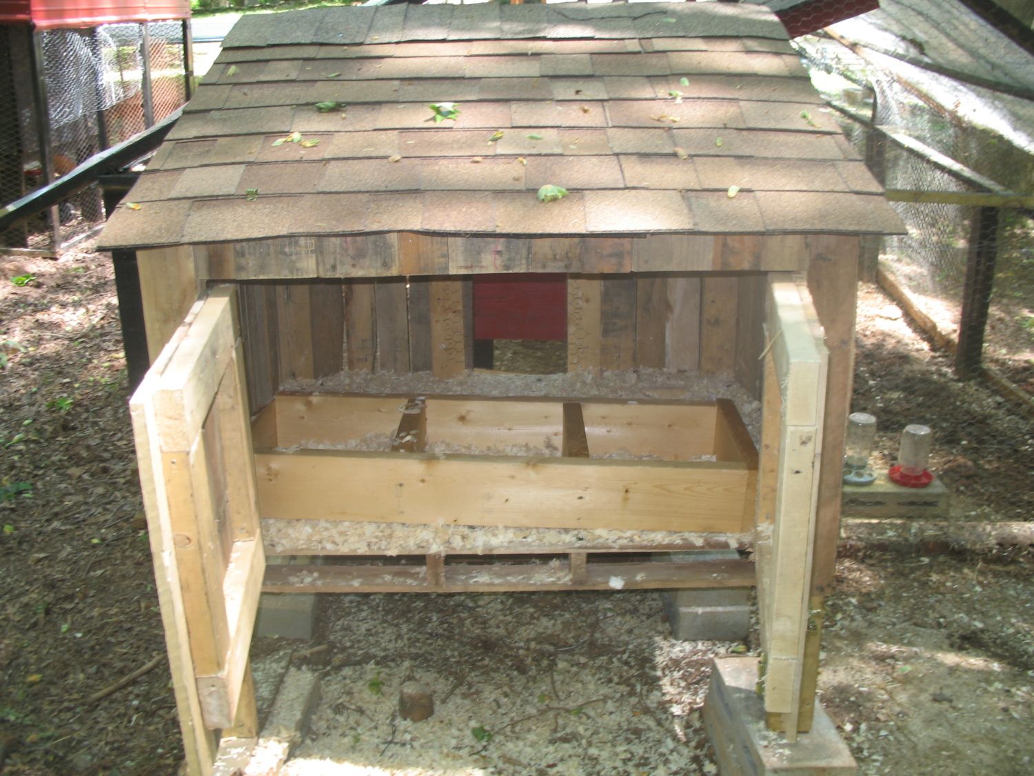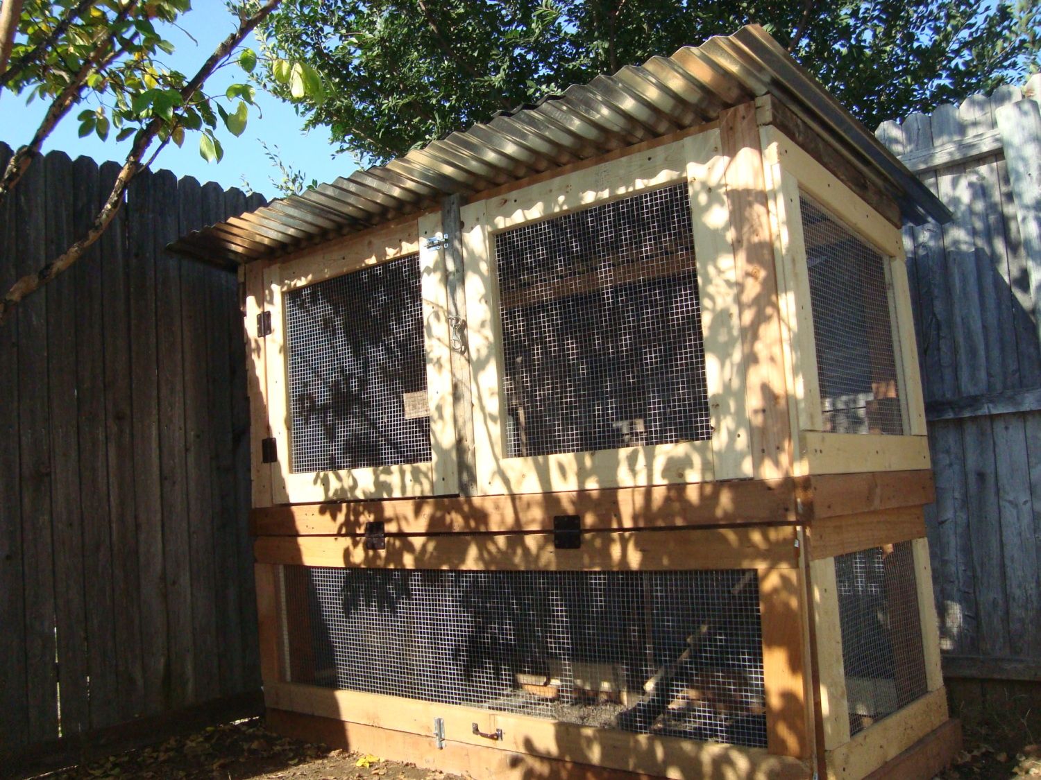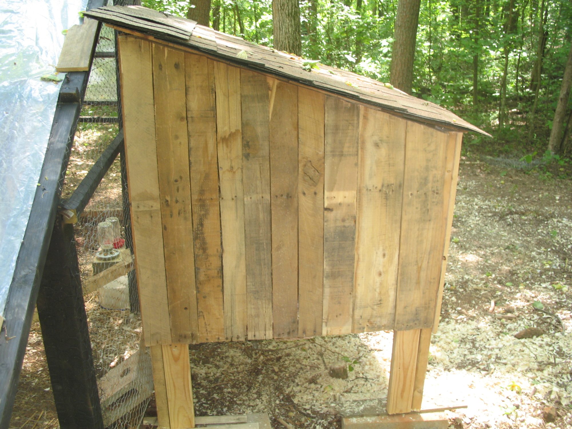 Here is a picture of one of our first coops. It was constructed of cedar fence pickets (but pallets could be used, too). -metal roof on top, hardware cloth and latches. We used recycled/leftover fence that was donated by a neighbor. Materials were around $60.00. Four hens were housed in this. They did spend most of the day on the lawn, however. (We eventually purchased an 8 x 12 shed kit and customized it for the gals, along with a 300 sq. ft. run. More room is always better!) -top floor had two nesting boxes and roosts. -bottom floor was a small run with food/water and sand for dust bathing.