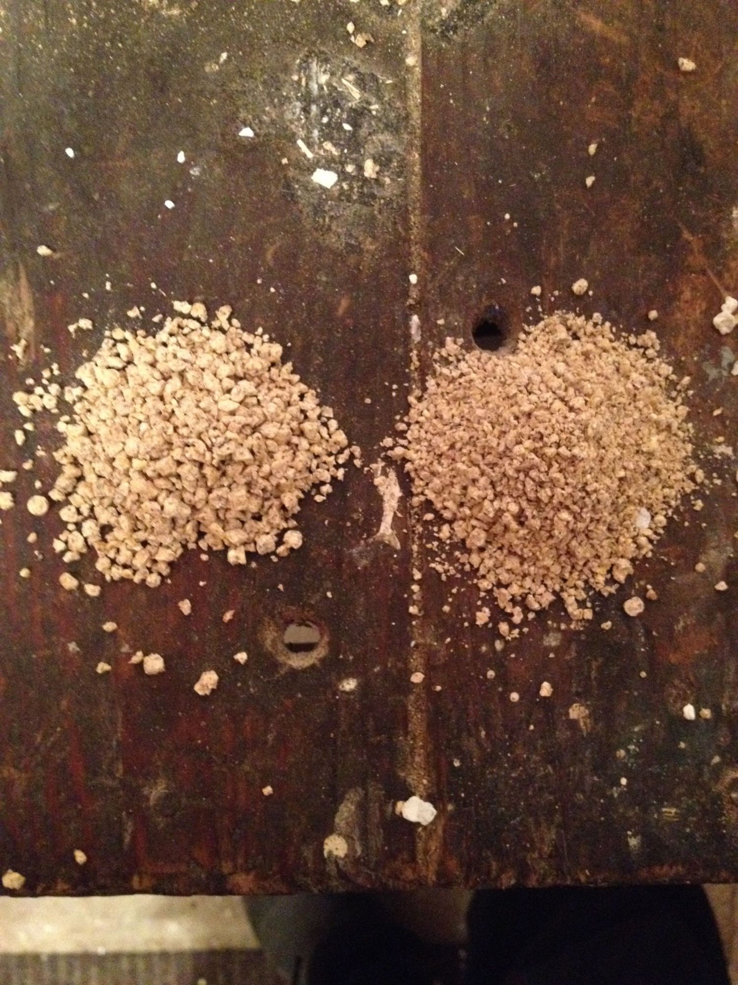 The difference in the particle size is most likely either a difference in the crumbler equipment at each mill or the type of binding agent used to make the pellets.