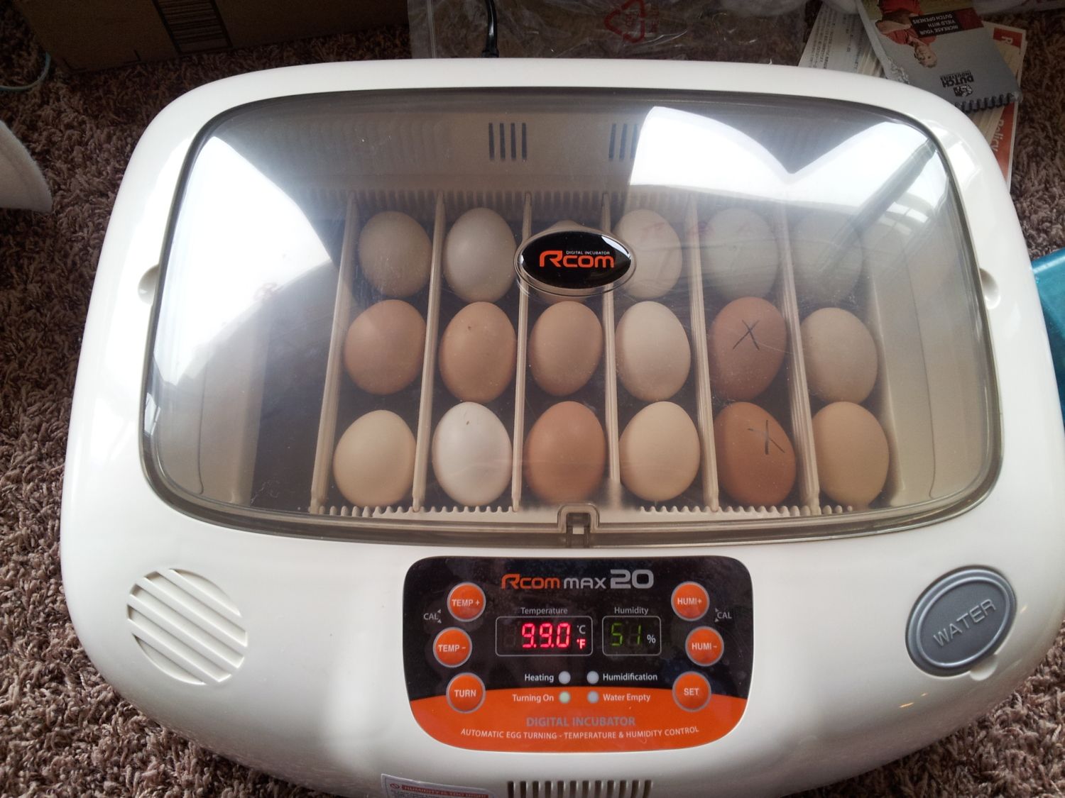 The instructions are hugely inadequate for a novice, especially a first timer. It said to turn it on and adjust the temp knob until it could maintain a steady temp for 6-8 hours, then to add water and put the eggs in. It didn't say how much water, and it didn't say what temp the water should be. It just said to add water to the "moisture rings." So I filled the rings, luckily using warm water but obviously not warm enough. The rings held a cup of water. It did not say to determine if the incubator could hold a steady temp after adding the water, so I didn't. It did not say to prewarm the eggs up slightly before putting them in a warm incubator, so I didn't. I just put the huge amount of water in, put the eggs in, and closed the lid. It specifically said the incubator should take 2-3 hours to warm up again with the eggs inside, and to not open the lid for the next 24 hours. I removed one vent plug, as directed.