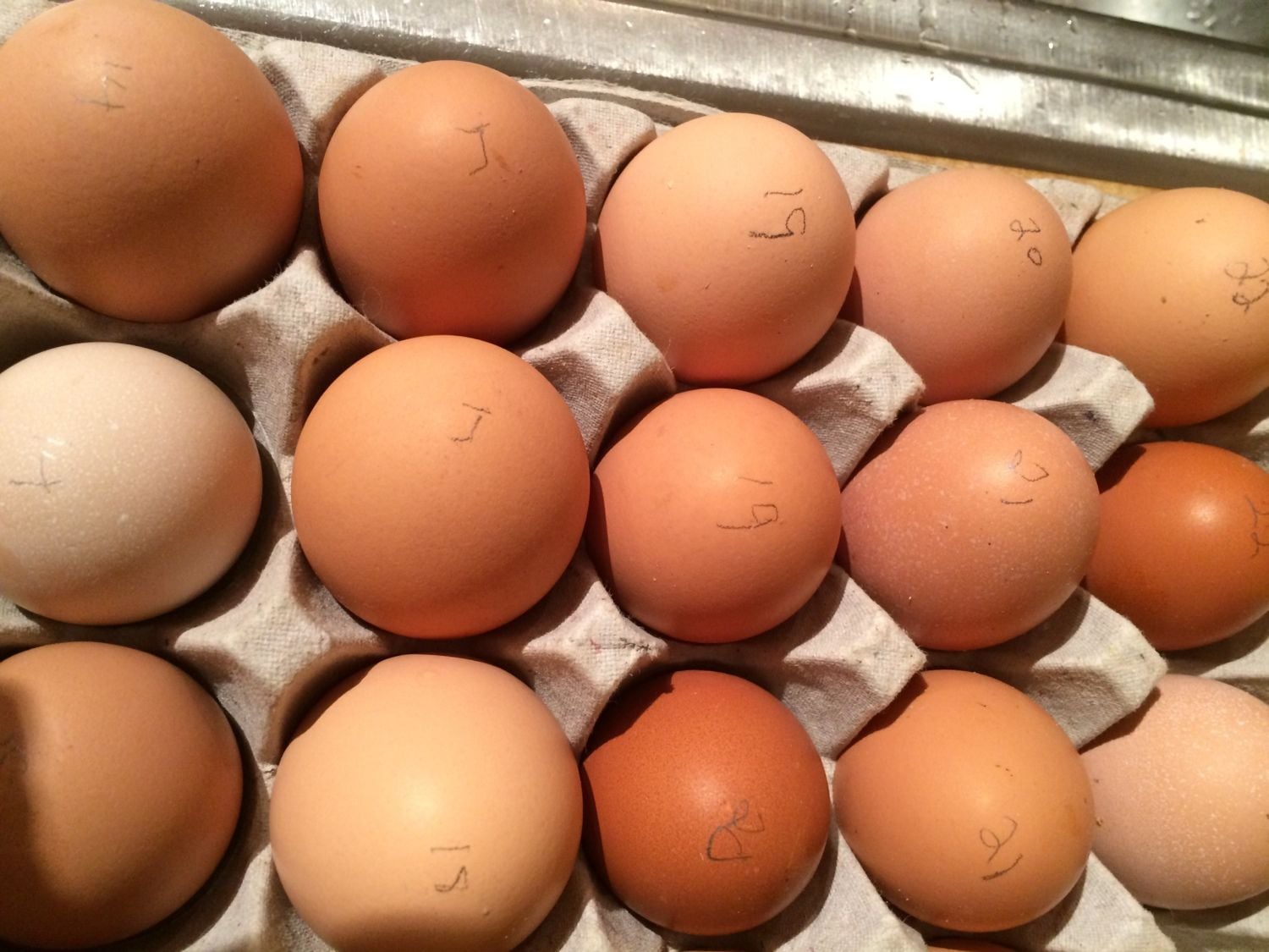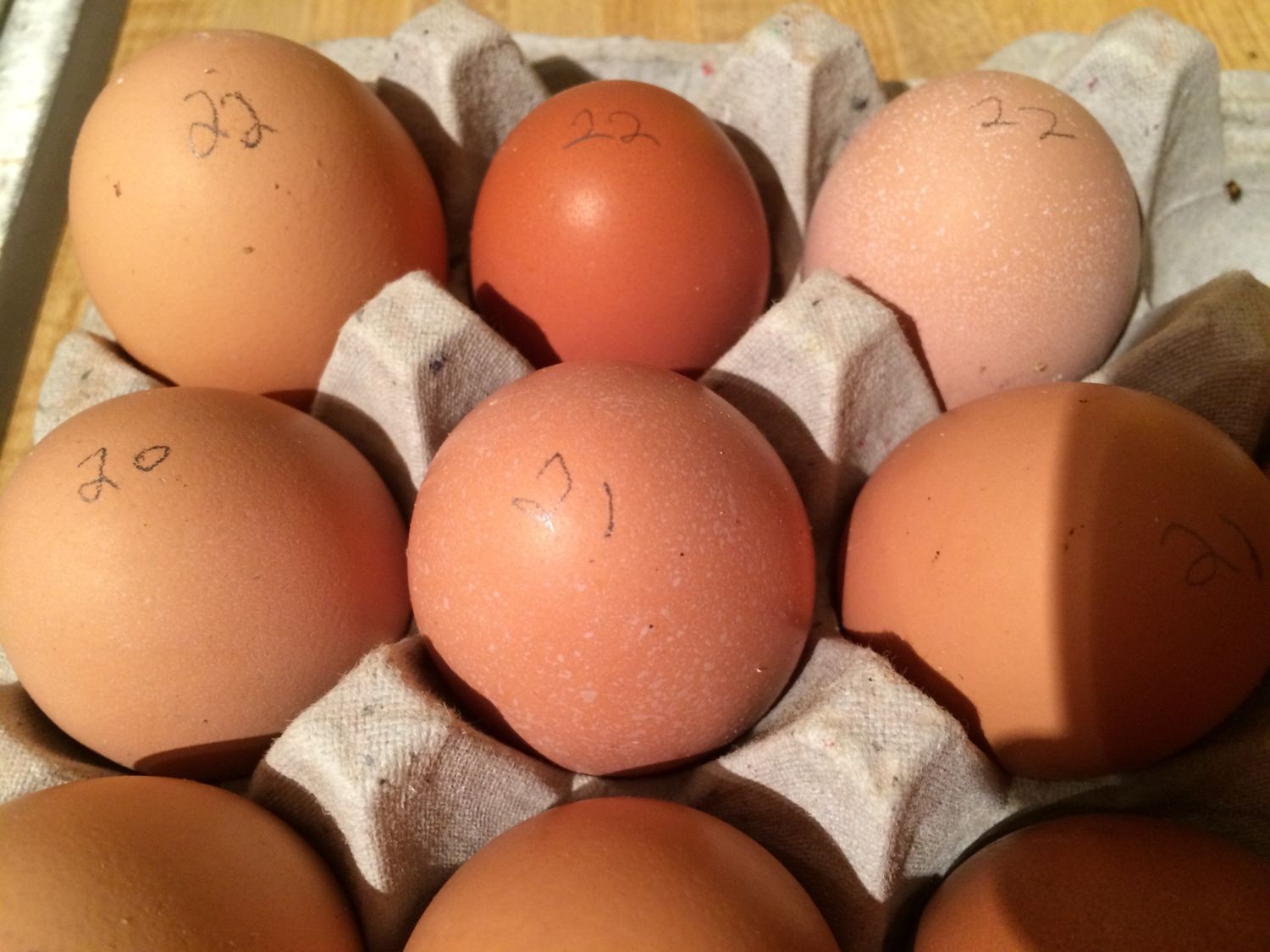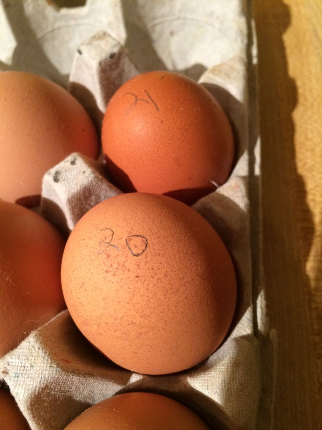 I'm giving my 1 year old red comets credit for the largest reddish brown eggs because those look like what they've been laying all year. I'm assuming the darkest brown eggs are my cuckoo marans, even though they are not as dark as I had hoped they would be. I have one egg that is very light tan (almost white) and then lots of variations of light brown. No sign of any blue (dang it). You can see in some of the closeups there is alot of "speckled" coloring.The pencil numbers on the eggs are the days I collected them.