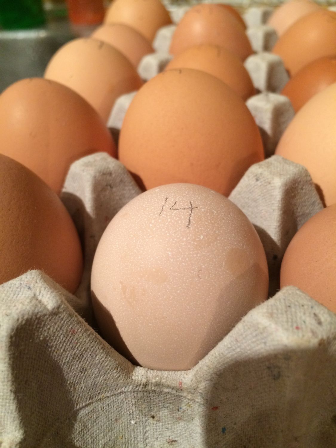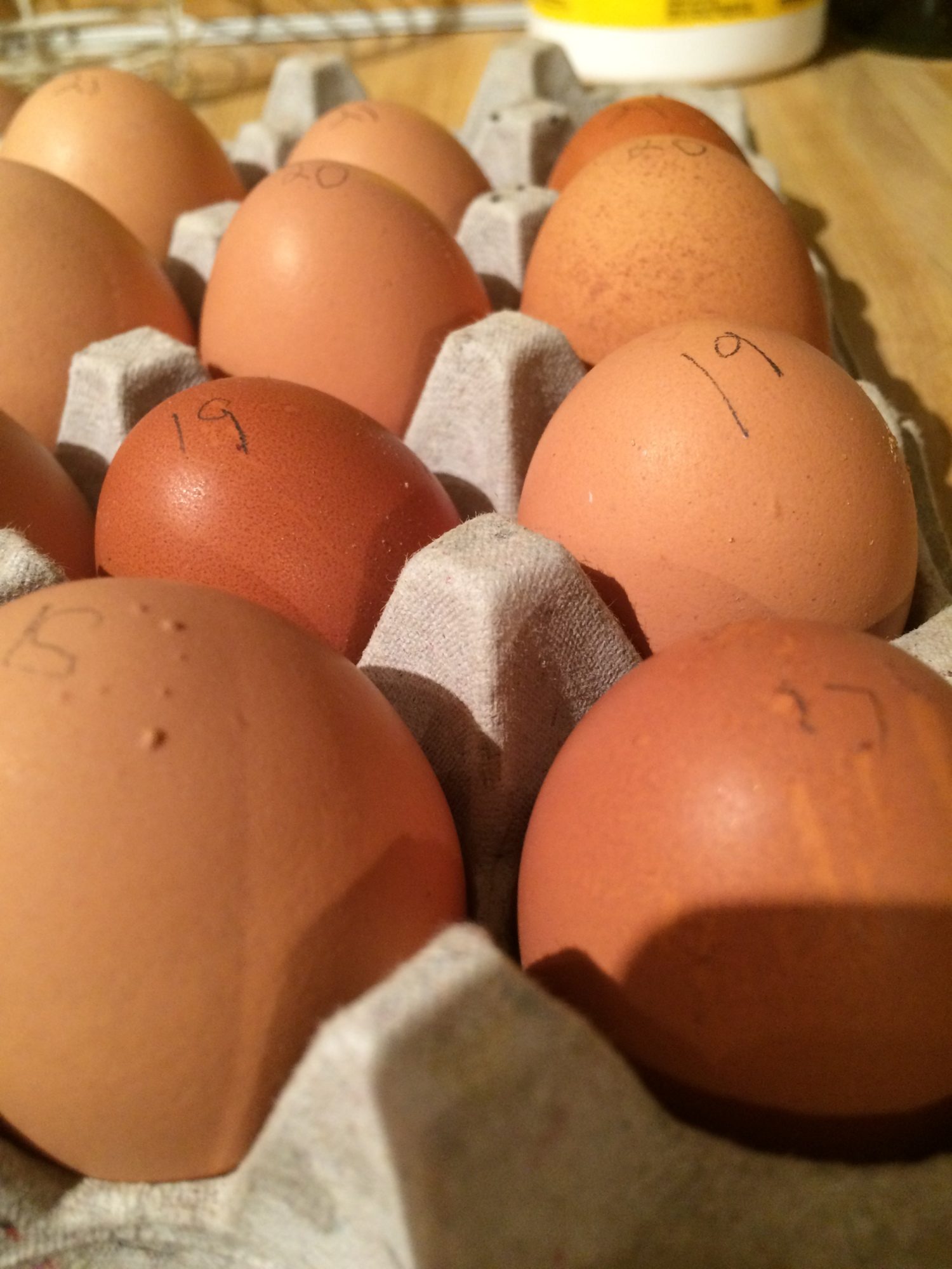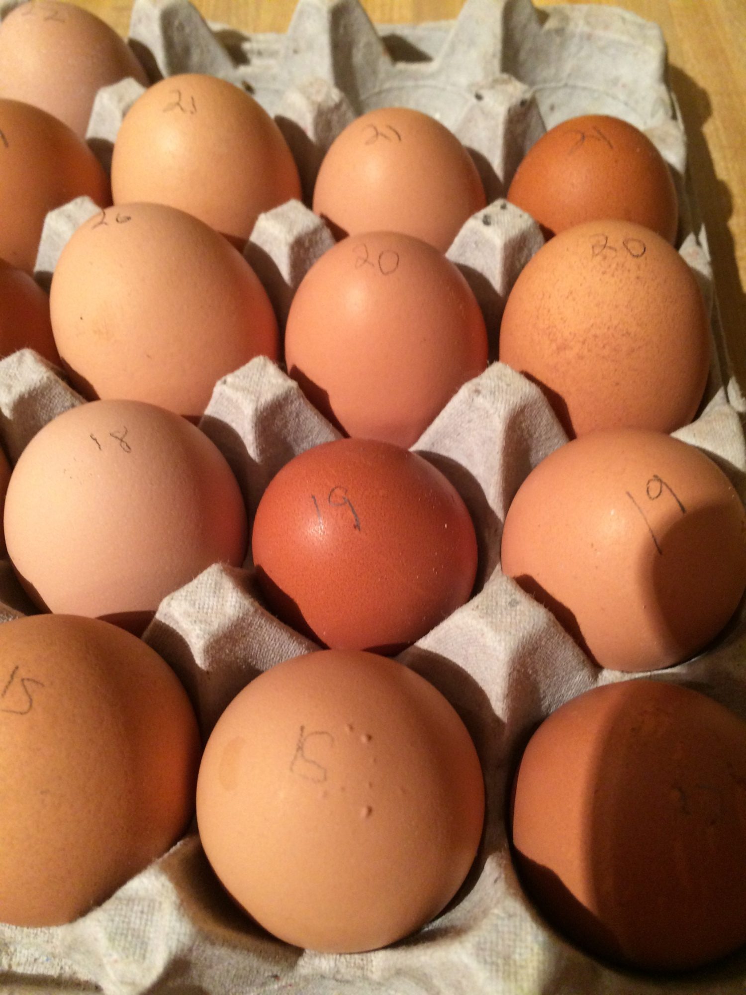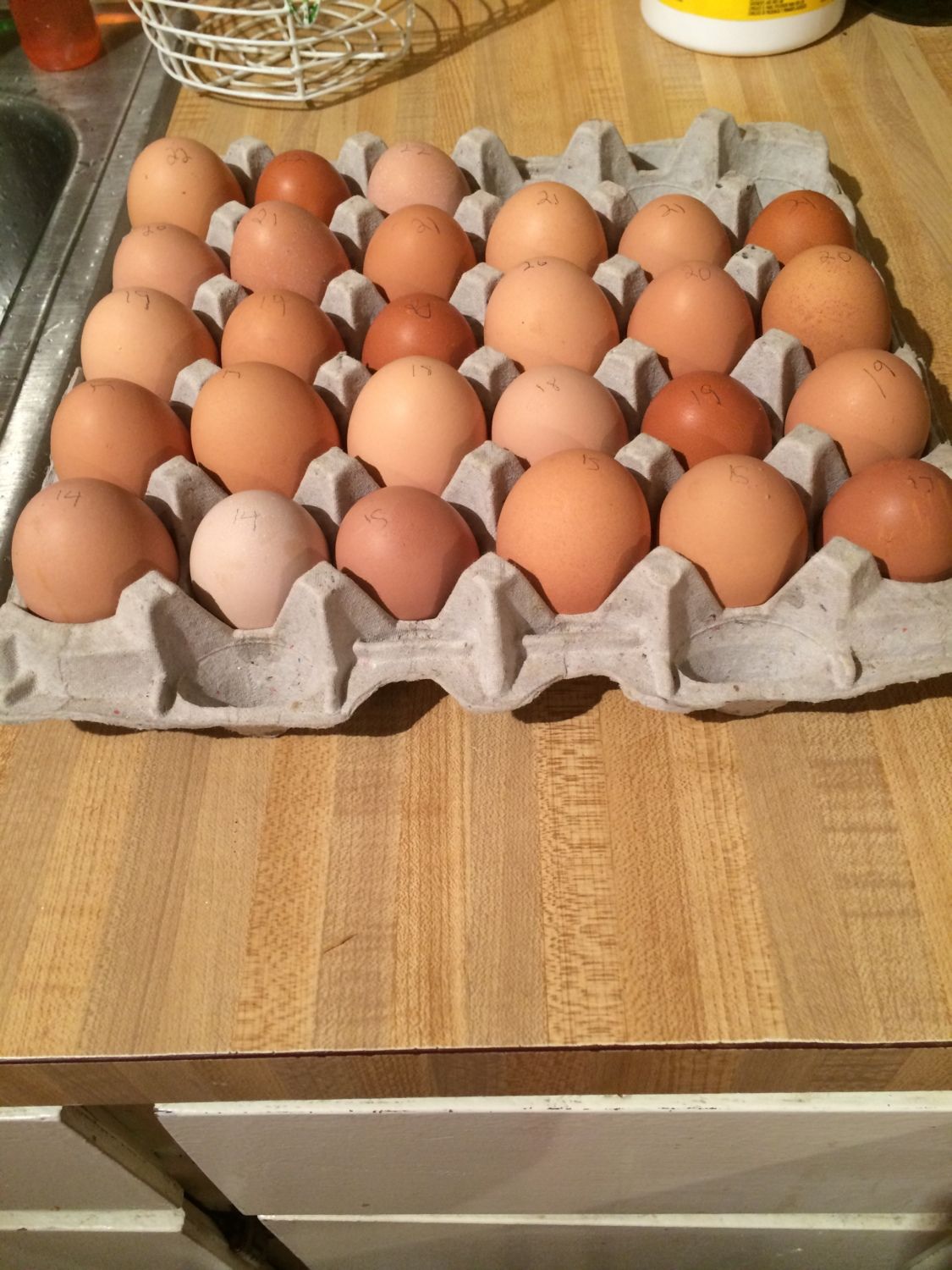 I'm giving my 1 year old red comets credit for the largest reddish brown eggs because those look like what they've been laying all year. I'm assuming the darkest brown eggs are my cuckoo marans, even though they are not as dark as I had hoped they would be. I have one egg that is very light tan (almost white) and then lots of variations of light brown. No sign of any blue (dang it). You can see in some of the closeups there is alot of "speckled" coloring.The pencil numbers on the eggs are the days I collected them.