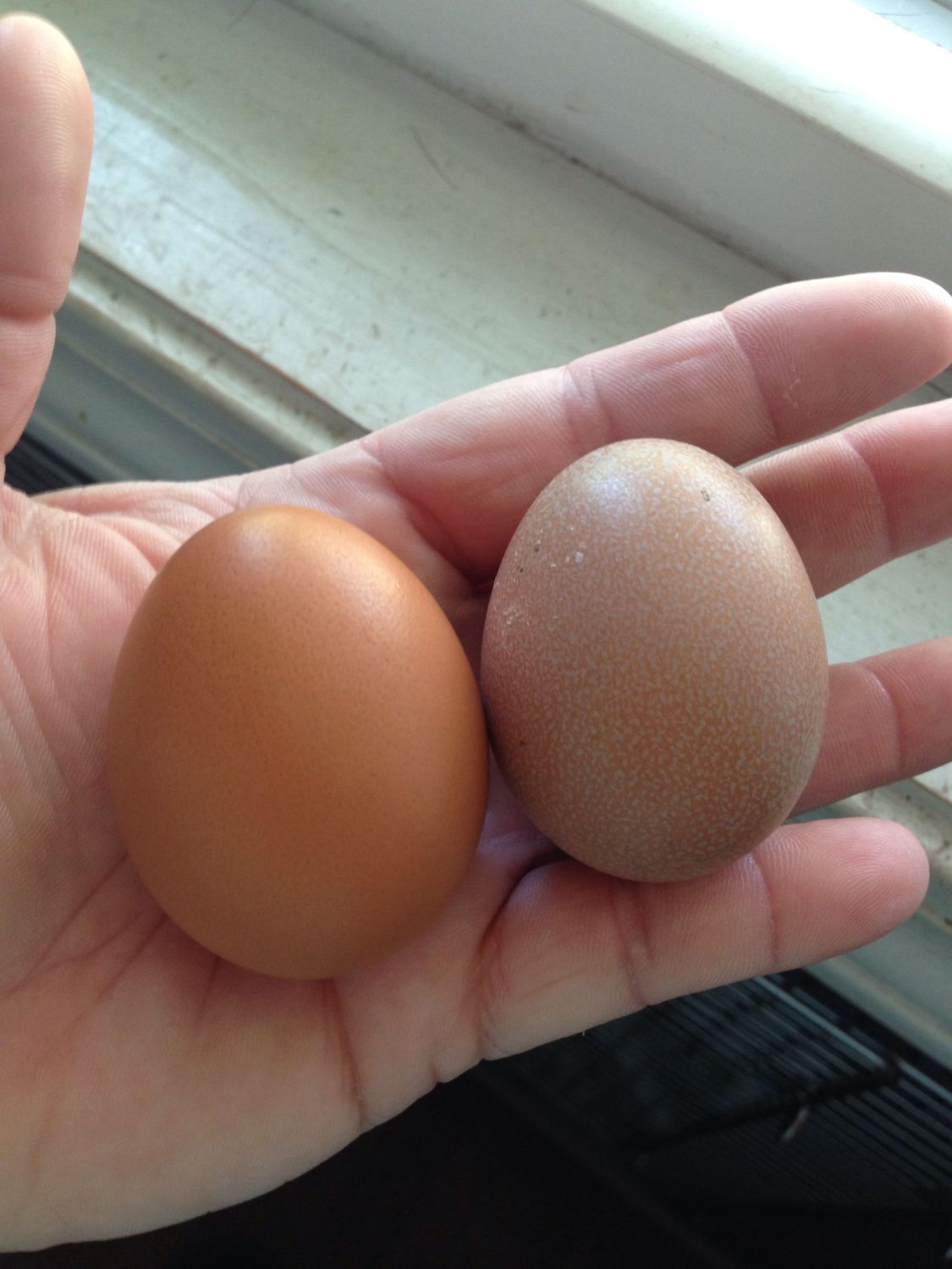 I'm only getting one egg a day. If both were laying they would be more than that. Plus the other one that is showing signs of laying is an Easter egger. Only the first 2 looked like that on the right. The rest all look like on the left only gotten bigger.