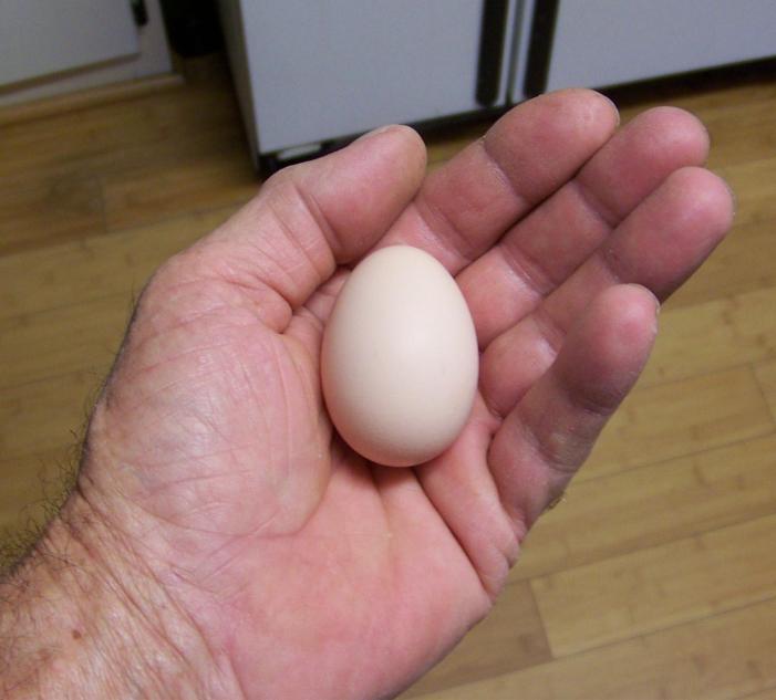 Well.... my wait is finally over! yay! Someone I don't know who or which breed...laid her first egg :weee from the early April chicks I bought.. Possibly an Australorp egg since they seemed to develop combs and wattles 2 weeks ago at age 17weeks? Or one of the 20 week old Barred Rocks? could remotely possibly be a Cinnamon Queen at 20 weeks, but the CQ combs are just barely showing a color change so far. ...but which-ever-one!!! yay! me!....errrr... yay pullet!! lol It was already cold, but definitely laid today, and after 10:30am when I checked last. Light tan-ish brown with a very slight pinkish tone? Just think!!..it only cost me $250 :lau for this first small egg. Hopefully there will be tons more to get that per egg cost somewhat lower... :rolleyes: