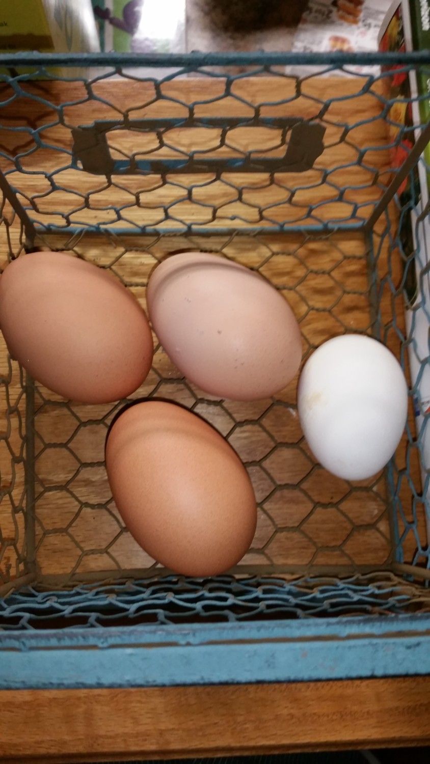 Found our first egg from one of our younger ones. The other 3 came from our GCs. Of the younger ones, the one who looked closest to laying was one of our EEs. The new small egg is kinda cream colored. She can still lay blue green eggs right?