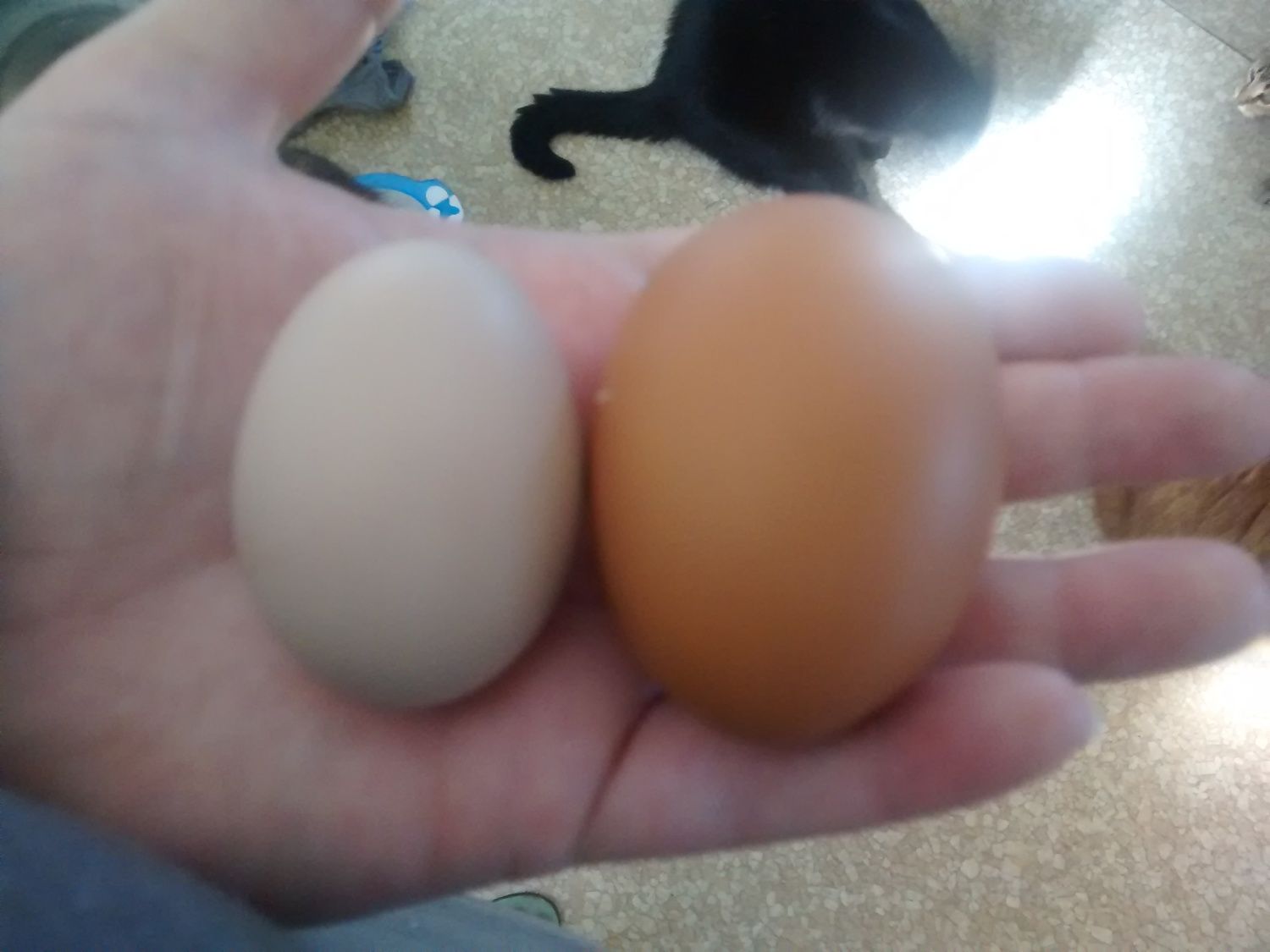 but I also got the little cochin, and my little self blue oegb. In truth I don't think the cochin is real good her legs seem kinda naked to me lol but she's cute and I don't really care although I would love some more maybe large and bantam sized. I have such an addiction. The third bantam egg quit very early and I never found out what it was, I wish it would have hatched. But from what I've heard for my first hatch and shipped eggs 8/17 was awesome especially BC three silkie eggs weren't fertile. Yay! And I love them all. Still not sure on the sex of two silkies but I got a gorgeous little splash and a beautiful partridge roo, three whites, and a little buff which I was told was a roo but that's okay we're keeping him anyway. The smaller very light egg is the one in question, the larger one is an Isa Brown egg I got yesterday from my almost 25 week olds.