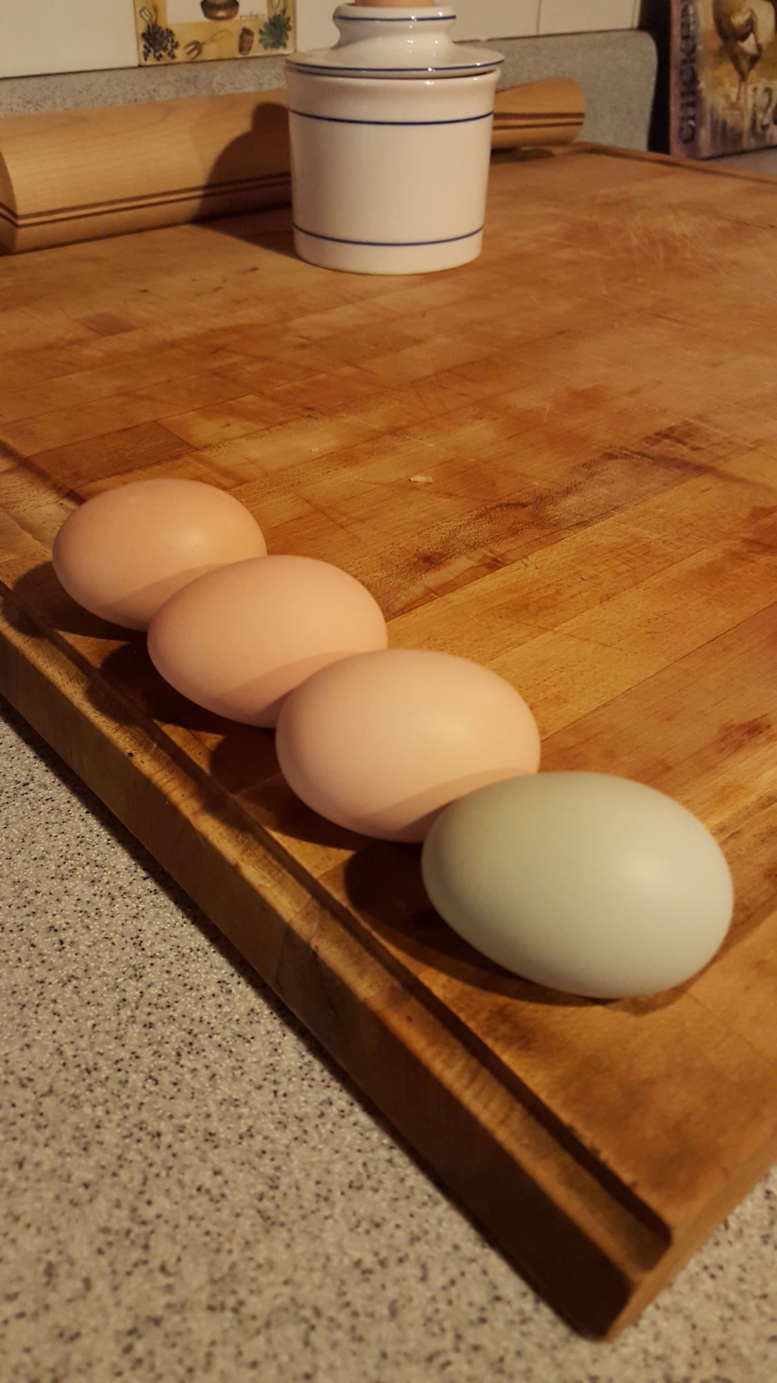 My Easter egger just laid her first egg and 20 weeks. The blue egg is from the EE the rest are from my other girls