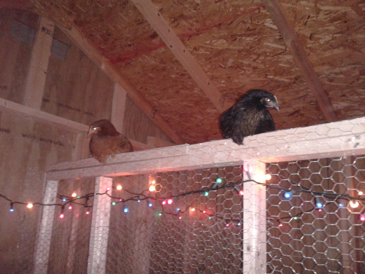 So I was shopping at Goodwill and found strands of Christmas lights. I put them up today and tonight they all went in on their own. I have a camera inside the the left half of my coop and I'm watching them. Not only did they go in, but a few are roosting, where they always huddled together on the floor before. I have a wire wall dividing my younger chicks from the older, and found out tonight that some of them are roosting ON TOP OF THE WALL!