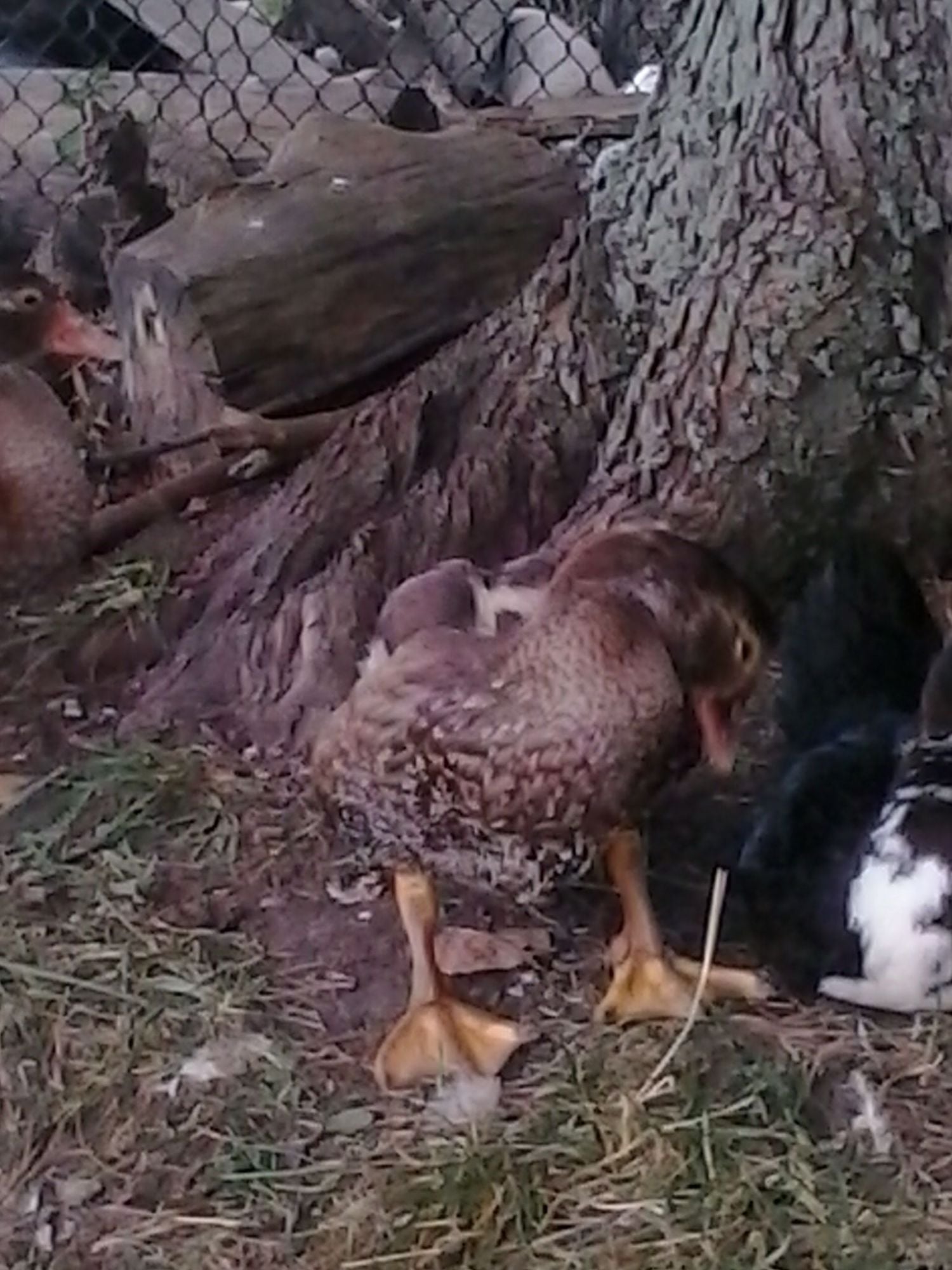 Aww poor boy, won't take long till he is a member of the flock.He watches them all the time but wouldn't go near them until I herded them all into the duck house when it was raining then he stood in the back in shock.
