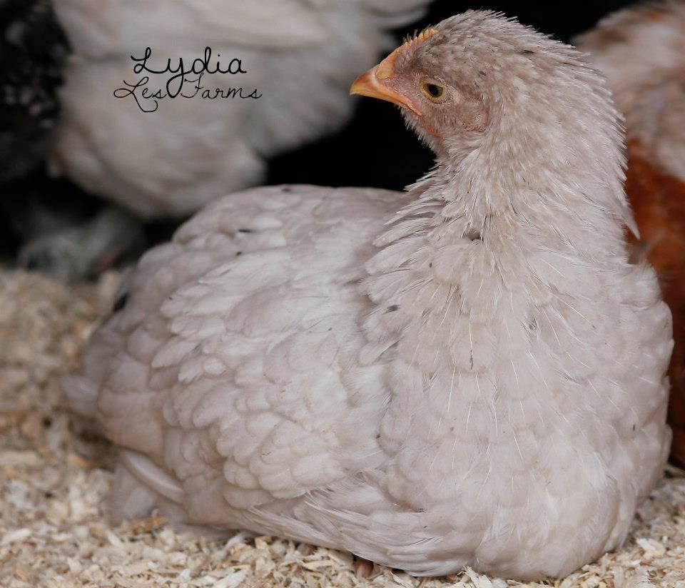 has some reddish coloring around her head and chest, and a couple of gray back feathers. Both have white earlobes and yellow legs. They were very friendly when younger, but are a bit more skittish than my EE now. Still, they will eat from my hand.