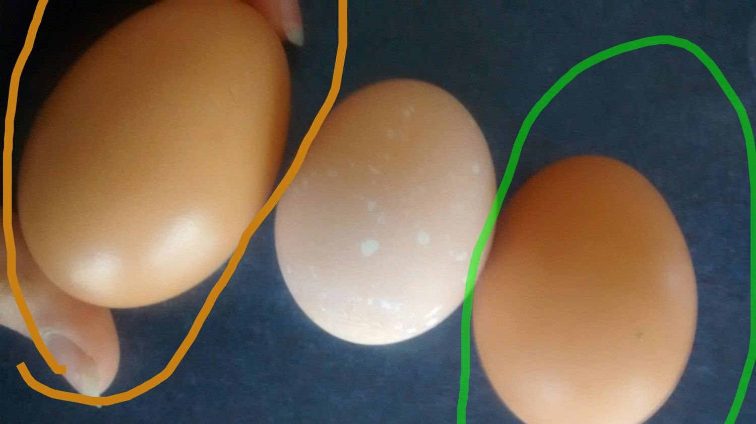 The egg circled in orange is my Brown sex link"s and the egg circled in green is my Black sex link's.