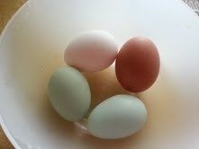 Today's eggs. Sorry it's a little washed out. In order from left to right 1. white/leghorn 2. brown/Isa Brown 3. Blue/EE 4. Blue/EE or other white chicken?
