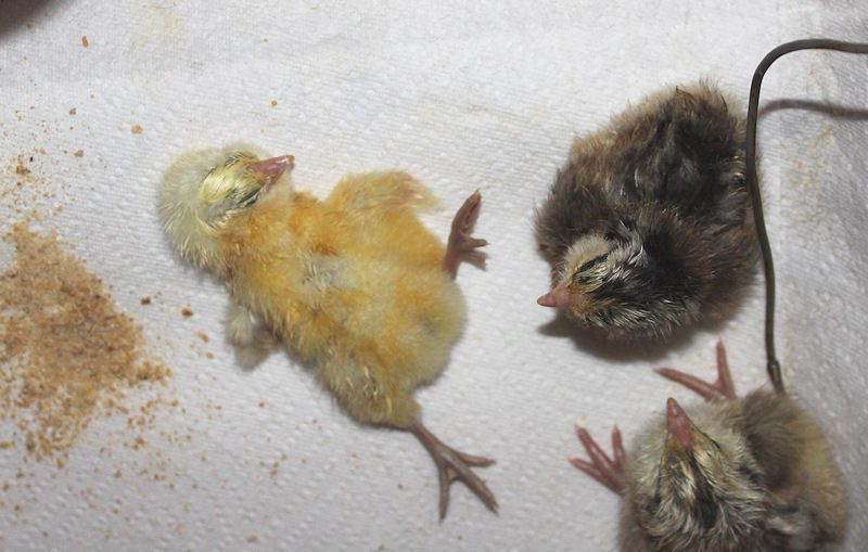 Total is 6 so far. When they are pipping rocking and hatching one right after the other, it's a real letdown when there are 6 eggs left and nothing happens for HOURS. I get a foreboding feeling that they are going to be duds. Does anyone else get this psychosis? Here are the first 3 in the brooder. "I've fallen and I can't get up!"![]()