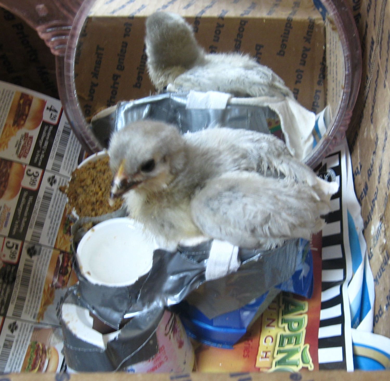 Ok here he is in it..not very pretty mostly everything is duct taped and piecemealed but its all that i can get to stick in the hot brooder room and this works well!!. His mirroru is his " Friend" since he doesnt have any .Poor guy /girl.Well i call him Harley he may be harlet oh! i didnt mean that... hummm Harleen?