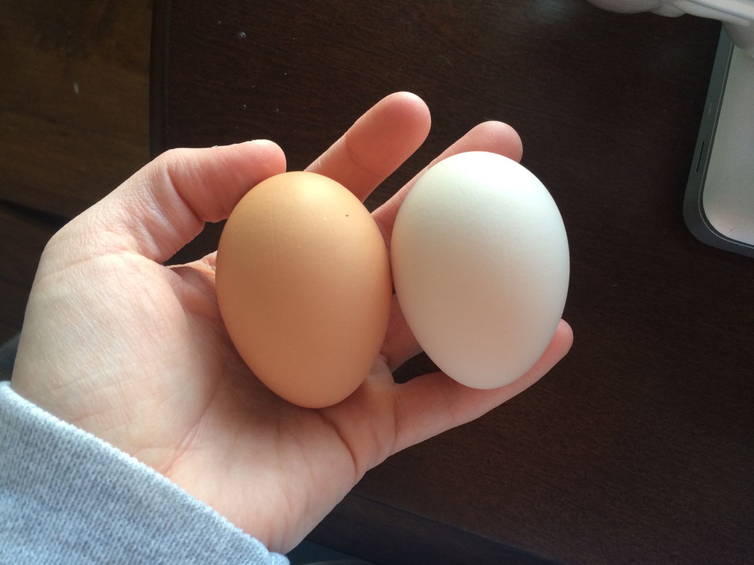 Here's some pictures and a comparison picture of the normal brown eggs we normally get and then the occasional light colored egg.