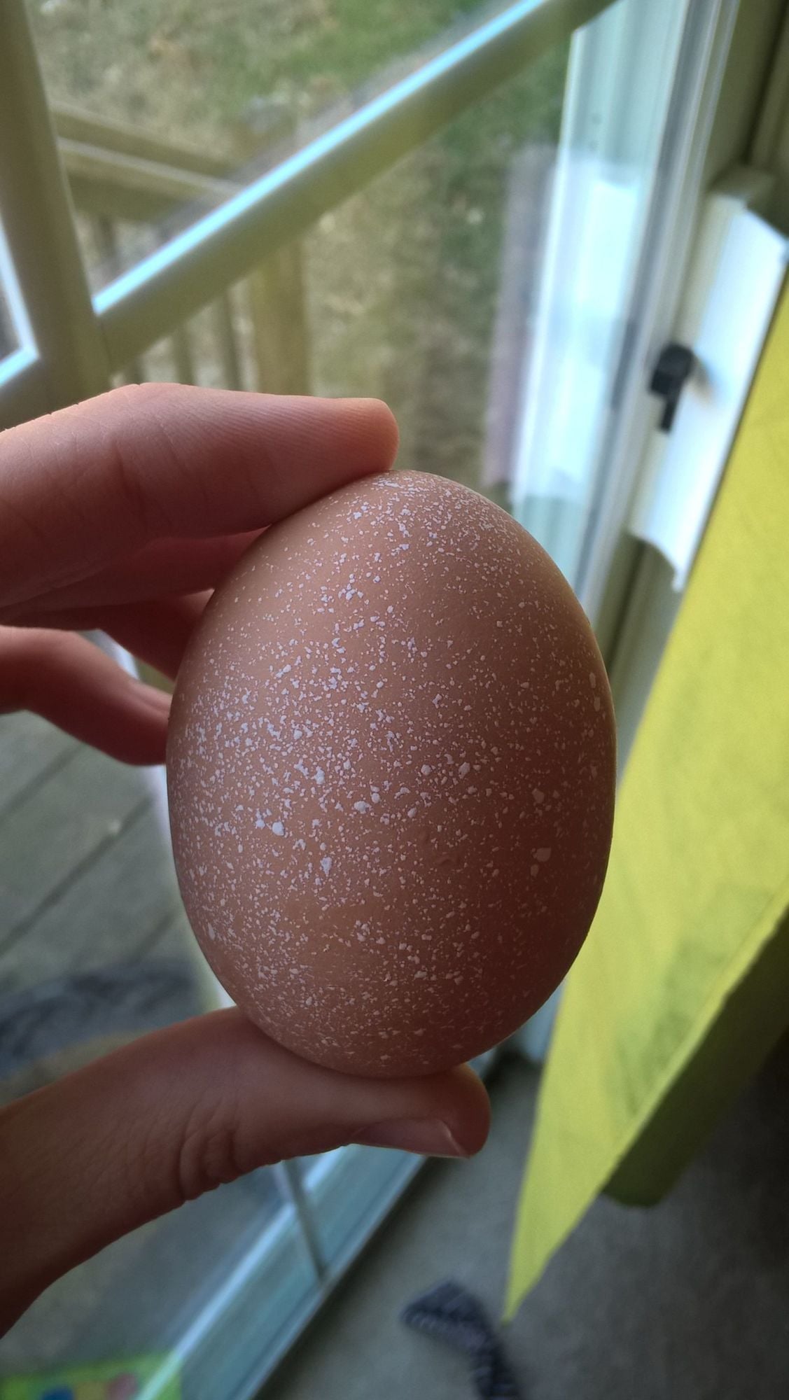 I have 2 buff brahmas, 3 RIR, and 3 buff orpington hens. They're 32 weeks and I'm pretty sure they're all laying, I just started getting about 3 eggs a day. I noticed some of them are speckled. Some have dark speckles, and some have almost white speckles. I'm wondering why they're speckled, and if the gal or girls laying them will always lay speckled eggs? My husband said the one with white speckles was fertilized. Is that a possibility?
