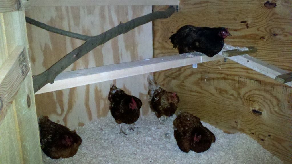 Last night was the 3rd night here at their new home. First 2 nights, I only managed to get 3 of them inside(2 slept underneath coop). Yesterday evening I made a point to get them inside at least 20 minutes before it got totally dark and close door. 4 sleep on the floor in the pine shavings, one flew up. The one on roost has slept in same spot each night