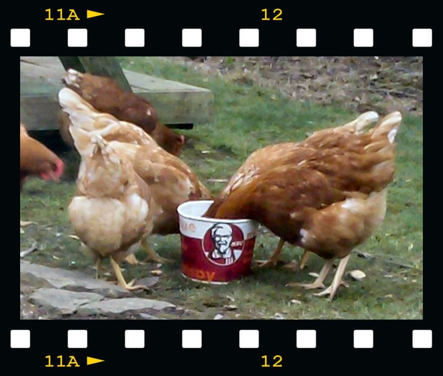 I thought I would show you this picture I took of them today. It was so funny, and don't worry, all that was in the bucket was cooked potato peelings and the KFC gravy. They went crazy for it, and I never thought I would see chickens so eager to get into a Bargain Bucket.
