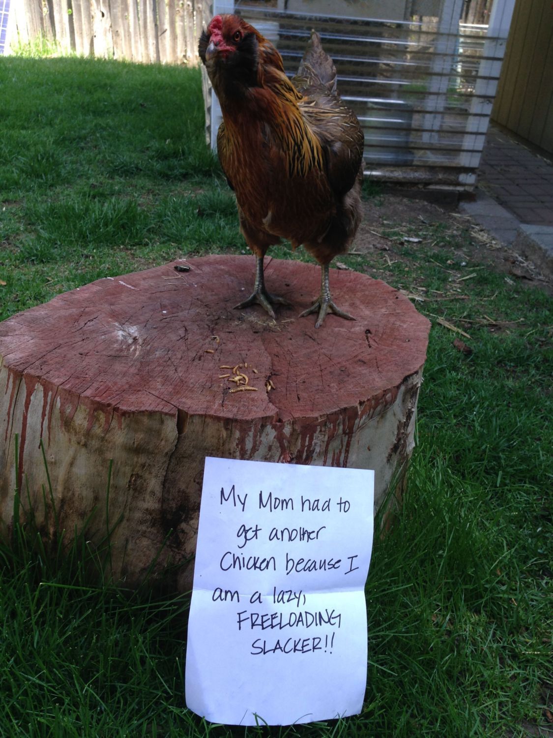 Still no eggs, and NO that is NOT blood on the chopping block, my husband put deck stain on it to protect it from the weather!