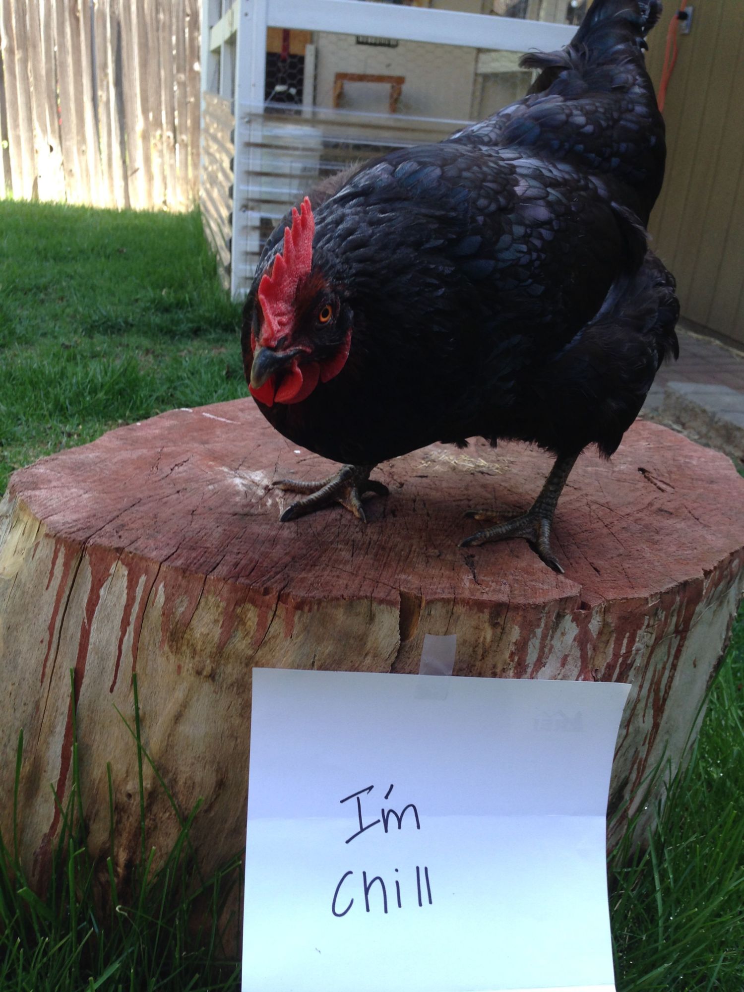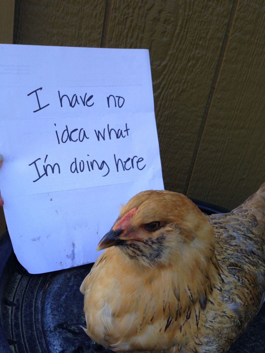Queenie, or Baby Chicken, as we call her, is clueless. Laura harasses her but the others are accepting her, she still thinks she's a person and sleeps in the house at night, she's too small to be confined to the coop with the Devil Chicken, Laura