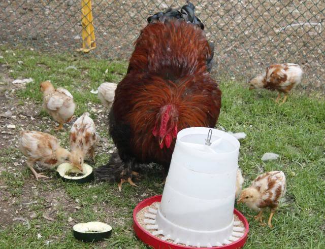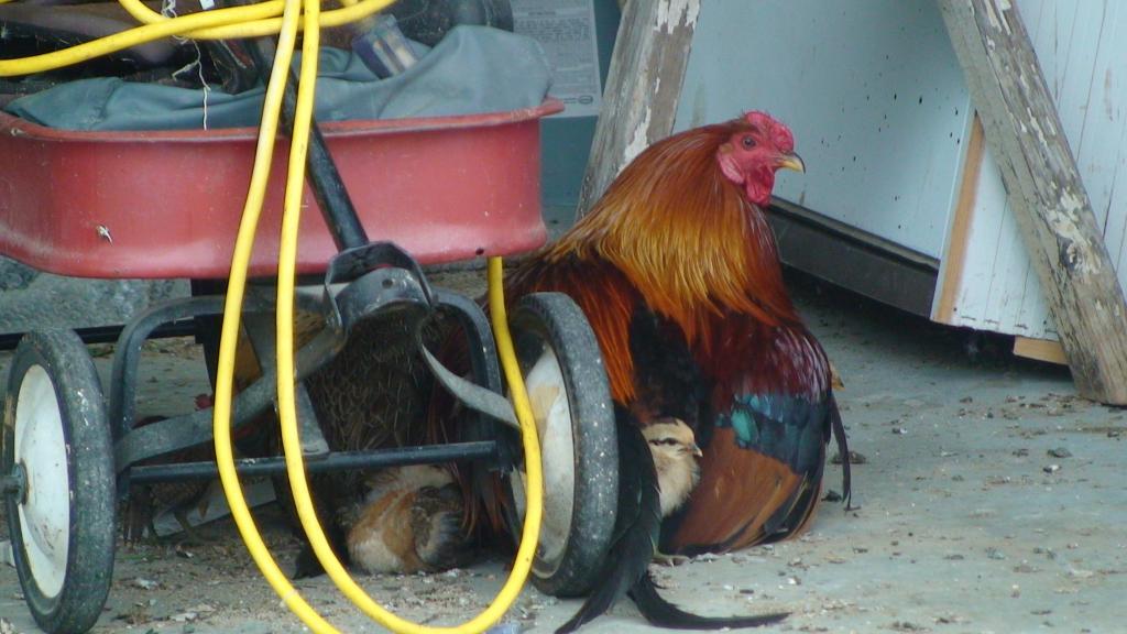 See images here of cock brooding chicks.