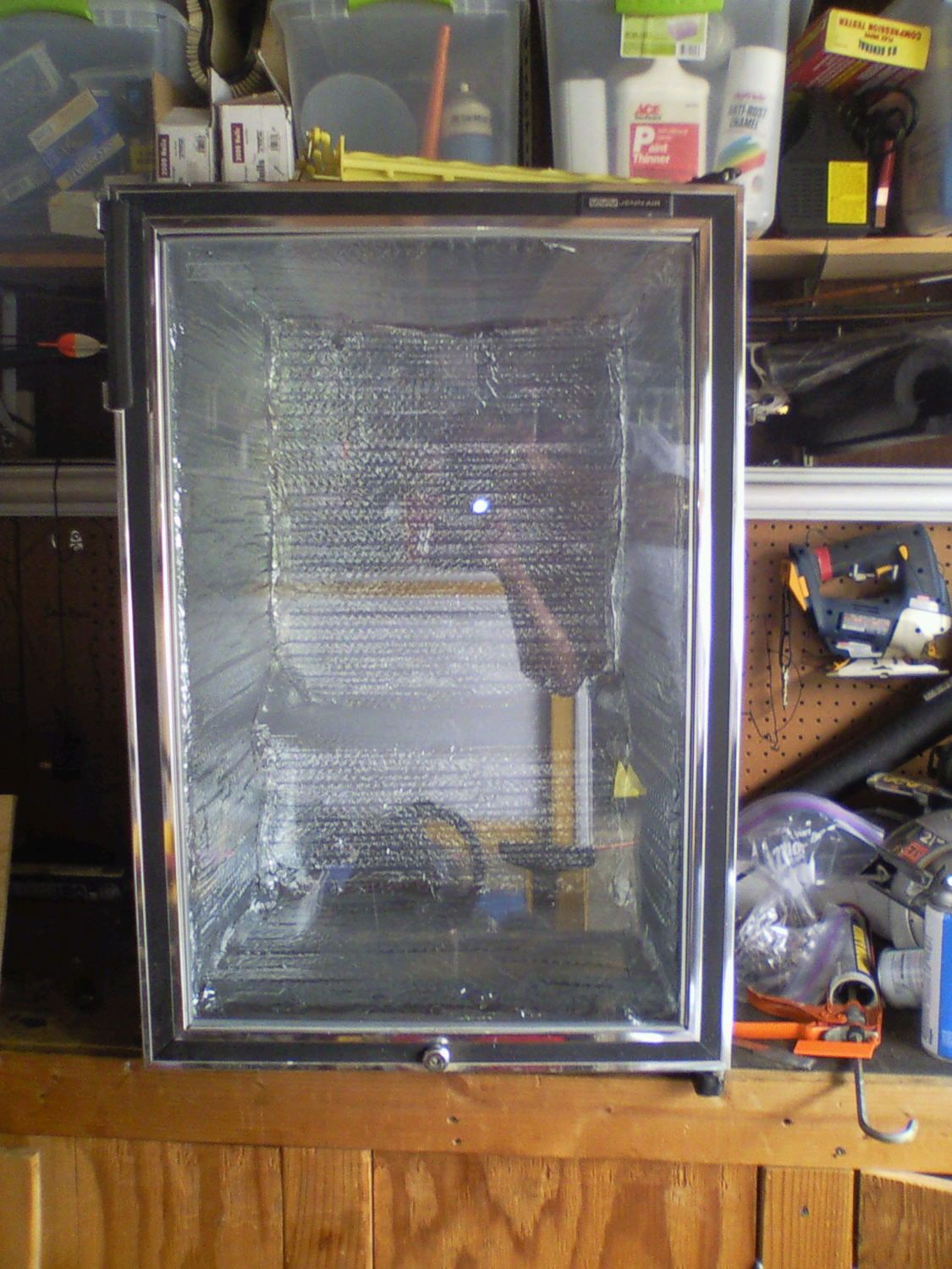 Thank You...That looks like a nice cabinet you have as well. I had seen were someone else had done the same thing with a wine cabinet that's what got me looking initially. I jumped on a site called Local Sales Network and did a search for cooler and this is what I found for 20 bucks, it was just pure dumb luck. I went to a yard sale the other day and found an aluminum tray 12x9 and 2 inches deep, welded corners and a half inch lip around it for 50 cents. I am gonna mount the water tray up top and the fan and heater unit on the back wall, I'm trying to save the space at the bottom for a hatching tray. Thanks for looking I'll post more pics as things progress.