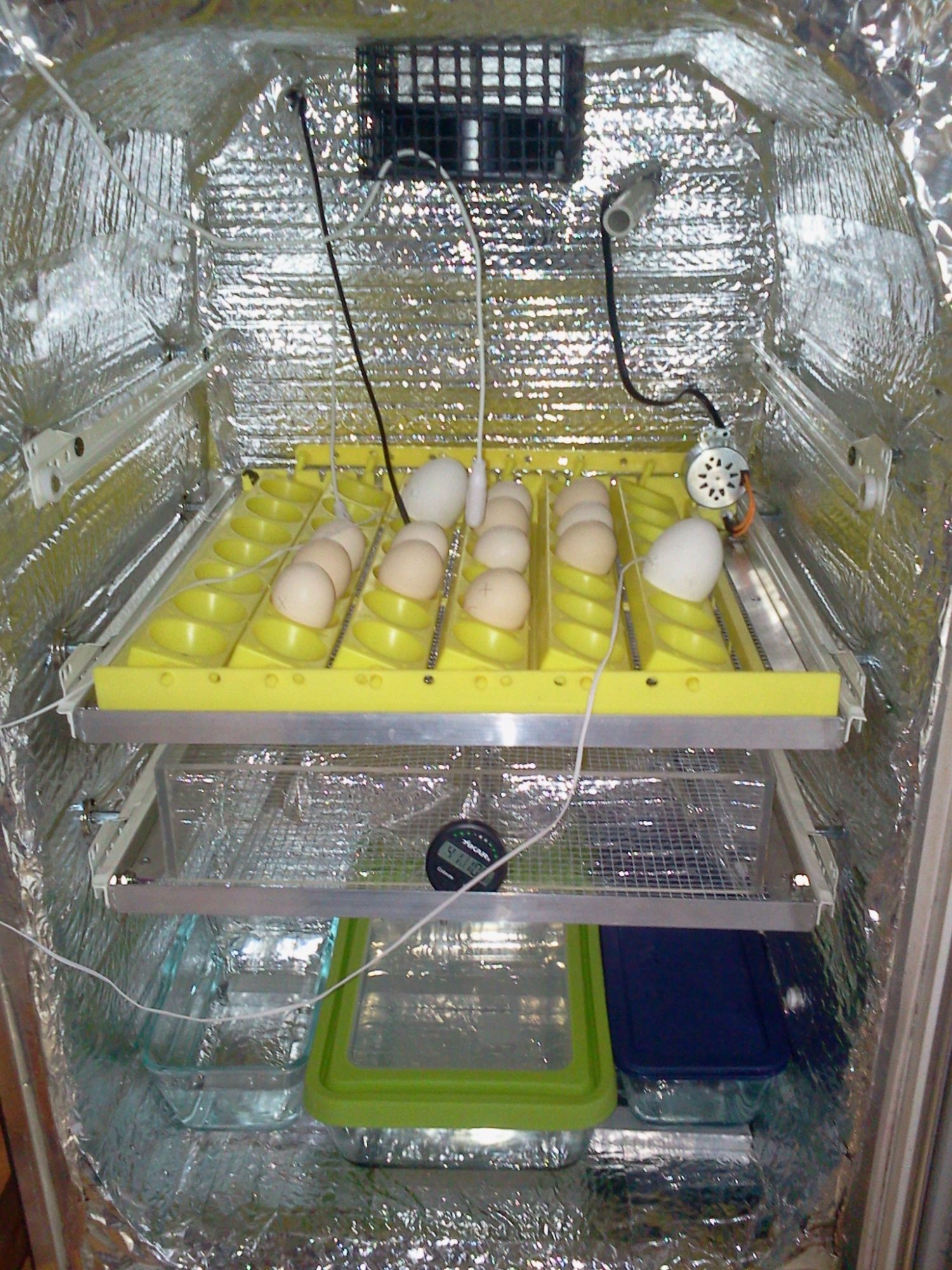 So far I added drawer slides for the trays so I dont have to lift them up and out.(Hard to do when full of eggs, found out the hard way!) I also had for lockdown and hatching I finished all of the plexiglass barriers. You can see in the pic on the second shelf down. This keeps the chicks from comitting Hari Kari off the trays. I also put a screen over the water trays just in case. It worked great for the RIR's and i will let you know on the silkie eggs in there now.