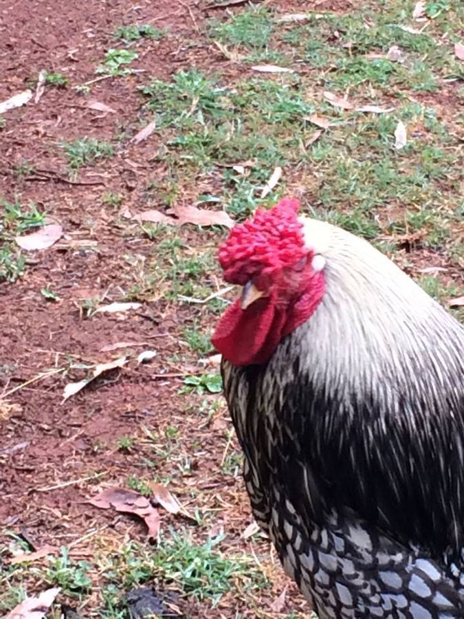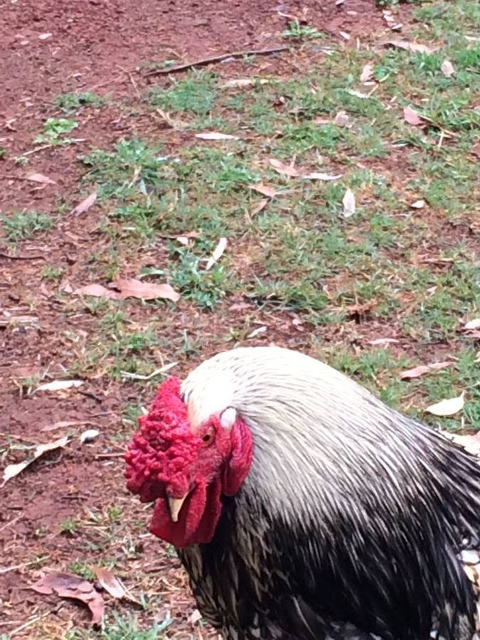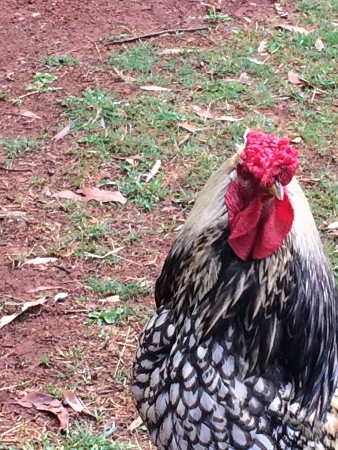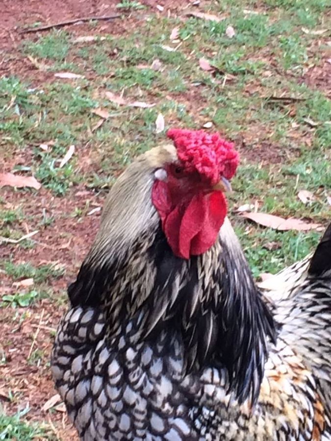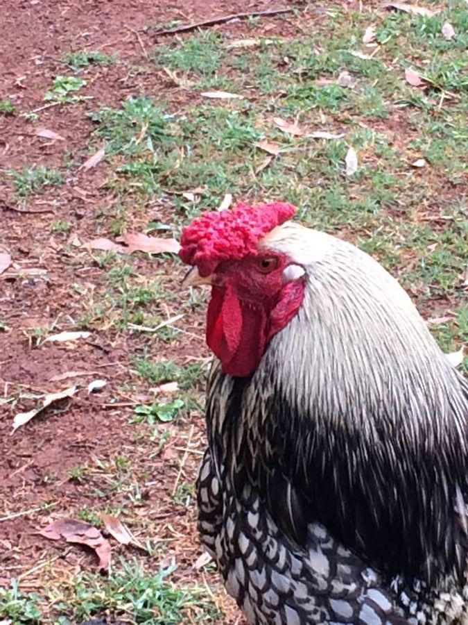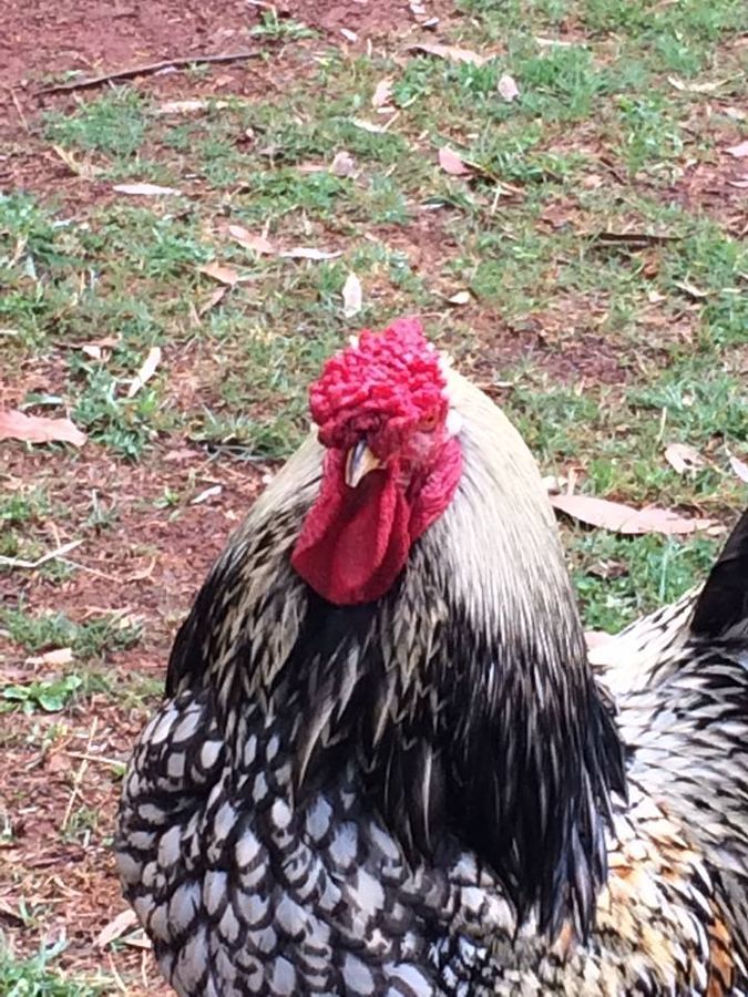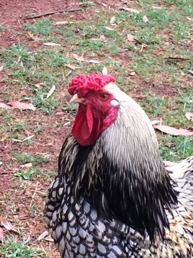 HI THIS IS PETE HE IS A CONFIDENT YOUNG ROOSTER (male) ONLY 1 1/2 YEARS OLD, MY FIRST BORN ON THE PROPERTY (or should I say my first born full stop, I was very excited); HE IS A CROSS BETWEEN HIS DAD A GOLDEN WYANDOTTE AND HIS MUM A SILVER WYANDOTTE, HE LOVES TO HARASS THE HORSES AND SHEEP ON THE PROPERTY JUST TO SHOW THEM WHOS BOSS. He is gentle in nature and always looking after his girls.