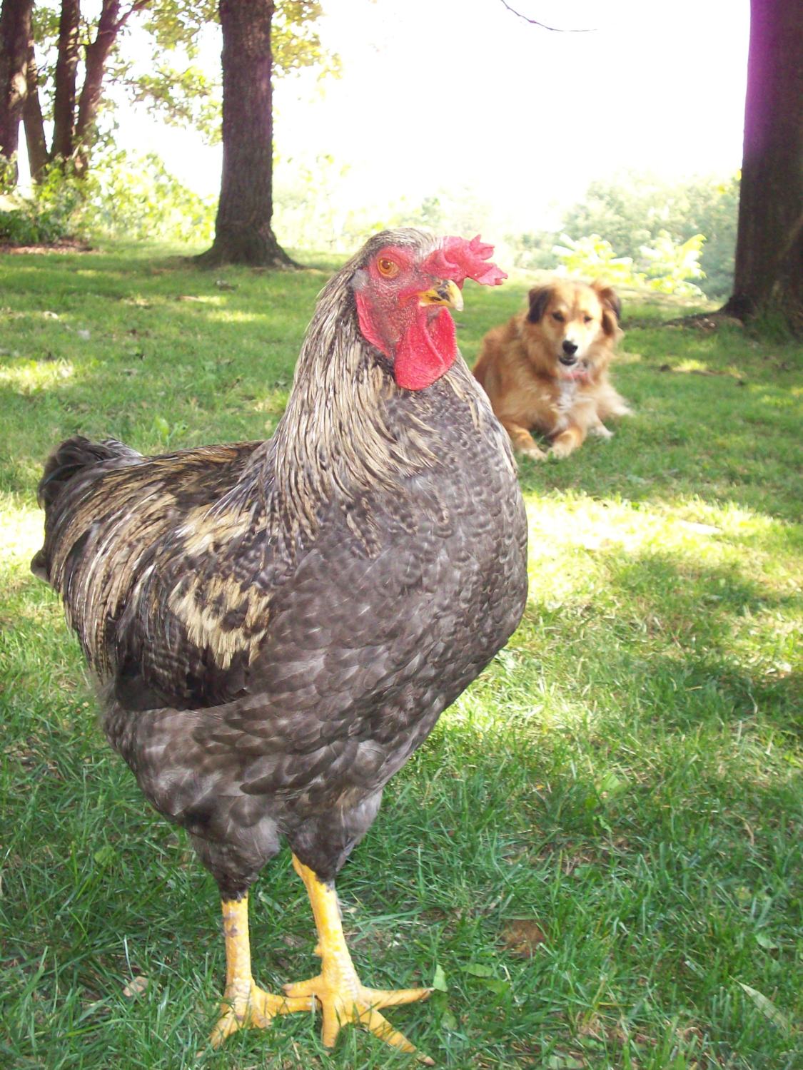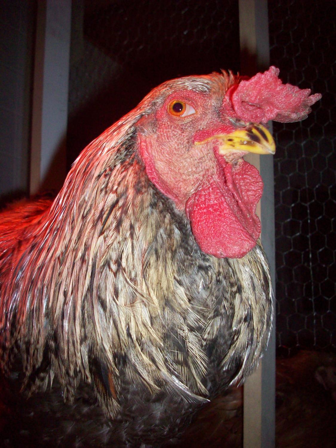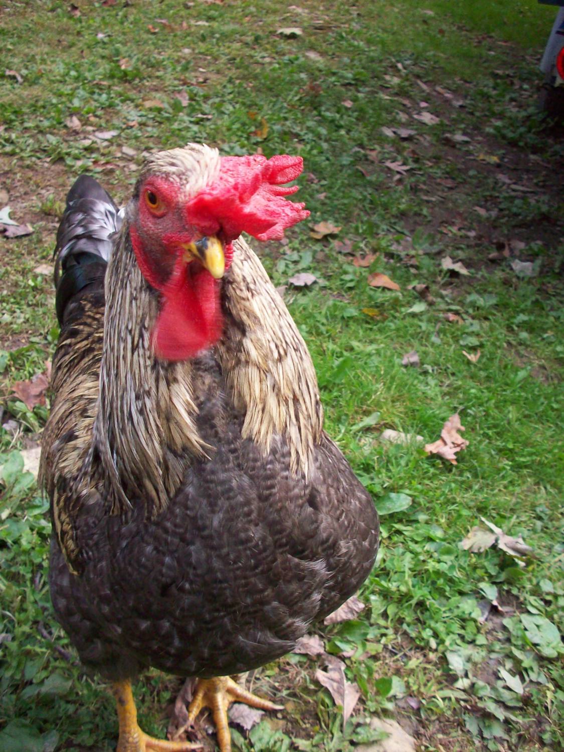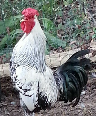 HI THIS IS PETE HE IS A CONFIDENT YOUNG ROOSTER (male) ONLY 1 1/2 YEARS OLD, MY FIRST BORN ON THE PROPERTY (or should I say my first born full stop, I was very excited); HE IS A CROSS BETWEEN HIS DAD A GOLDEN WYANDOTTE AND HIS MUM A SILVER WYANDOTTE, HE LOVES TO HARASS THE HORSES AND SHEEP ON THE PROPERTY JUST TO SHOW THEM WHOS BOSS. He is gentle in nature and always looking after his girls.