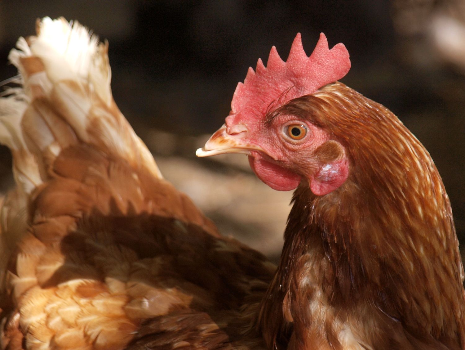 Croakie, the two-year-old Red Sex-Link hen. She was purchased from a commercial egg farmer who had all his hens' beaks trimmed, thus she looks like she has an underbite.