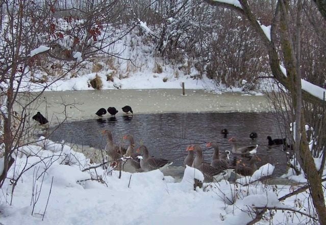 water birds are enjoying the last of the open water but tonite is supposed to be -12°C so looks like into the pen for them. Will try and see how goosies do loose before confine to pen. Besides their pen is full of roosters I haven't gotten around to butcher yet.