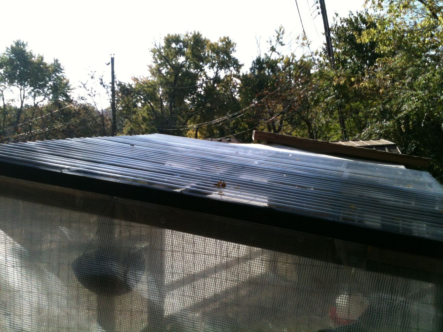 From the side, we were pleased to see that there was very little warping or settling of the run which up until now was just kind of out there in the elements. So, we were pleased to see that not only was it still square, which made mounting easy, as the pergola was built square, the slope of the roof matches that of the coop still... hooray.