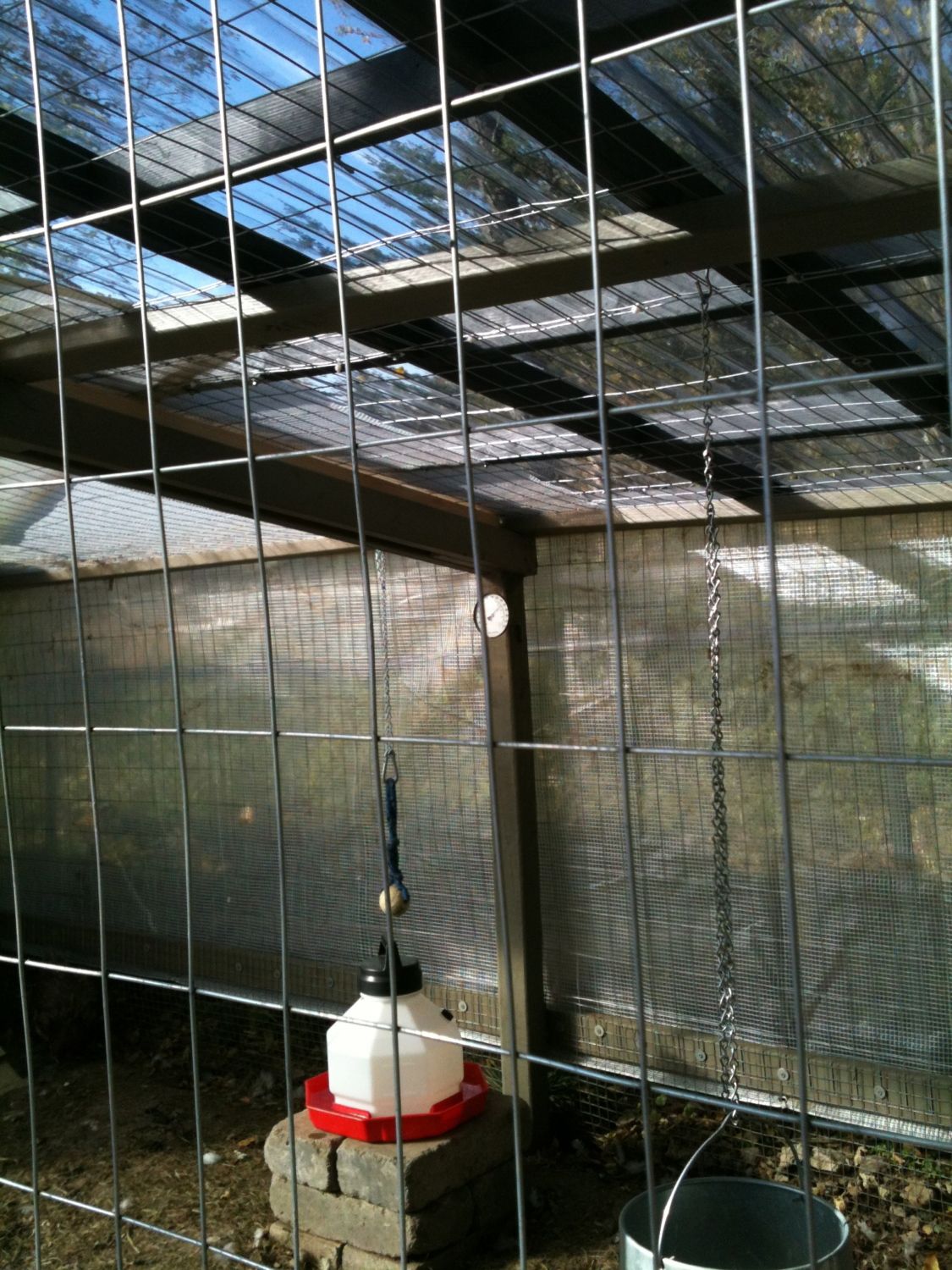 Hey guys... back on page 24, I posted about building a more permanent covered pergola for my girls' run, and then promised to edit with pictures of it when I had the light to do so... And then we had an awful week... culminating in having to put our 11 year old dog, Ajax down... He just... at around 5pm one night, he suddenly didn't have the energy or coordination to stand or walk anymore... by the time we got him to the vet the next morning, he was too weak to even lift his head... *trembly bottom lip and chin* *deep sigh* We were profoundly saddened... and it kind of wrecked our whole schedule... hubby had to cancel a flight for a business trip, I'm sure my client is wondering when I'll have their holiday sale poster done... etc... Anyway... With all the rain in the forecast this week, we decided to go ahead and start fitting the run with the winter tarps yesterday... This was what we looked like last year about this time... Here are some photos of how it looks today. From the front, it's not immediately obvious that the pergola is there. We painted the wooden bits of the pergola black to resemble the black of the roof on the coop. From the side, we were pleased to see that there was very little warping or settling of the run which up until now was just kind of out there in the elements. So, we were pleased to see that not only was it still square, which made mounting easy, as the pergola was built square, the slope of the roof matches that of the coop still... hooray. While the clear(translucent) tarps do a great job of keeping the water out, and allowing for a lot of light in, the clear covered pergola is superior in that regard. And, I'll never have to bring that feeder can inside again on account of rain when the tarps are off for summer. Weather is squirrelly here in the midwest in November... we're just as likely to have an 75 degree day on Thanksgiving as we are to have snow with lows in the 20s... As it was, it was in the mid 40's this morning when I went out there to scoop their coop and take the pictures around 10am and the thermometer inside their run was reading 70 degrees... The temperature in their coop according to my digital thermometer/hygrometer was in the mid 50's, so I popped the coop window facing in their run open and it's now reading 64 degrees/50% humidity in the coop... So, that's already a lot of passive solar heating right there, even with a 7'x7' section of their run left uncovered... and all of the trees aren't even naked yet either... We'll probably tarp up the door and remaining panel as soon as we are consistently not breaching into the 60+ degree range for daily highs... but, we are ready to go ahead and start hauling in bales of straw, as they should stay dry in there.