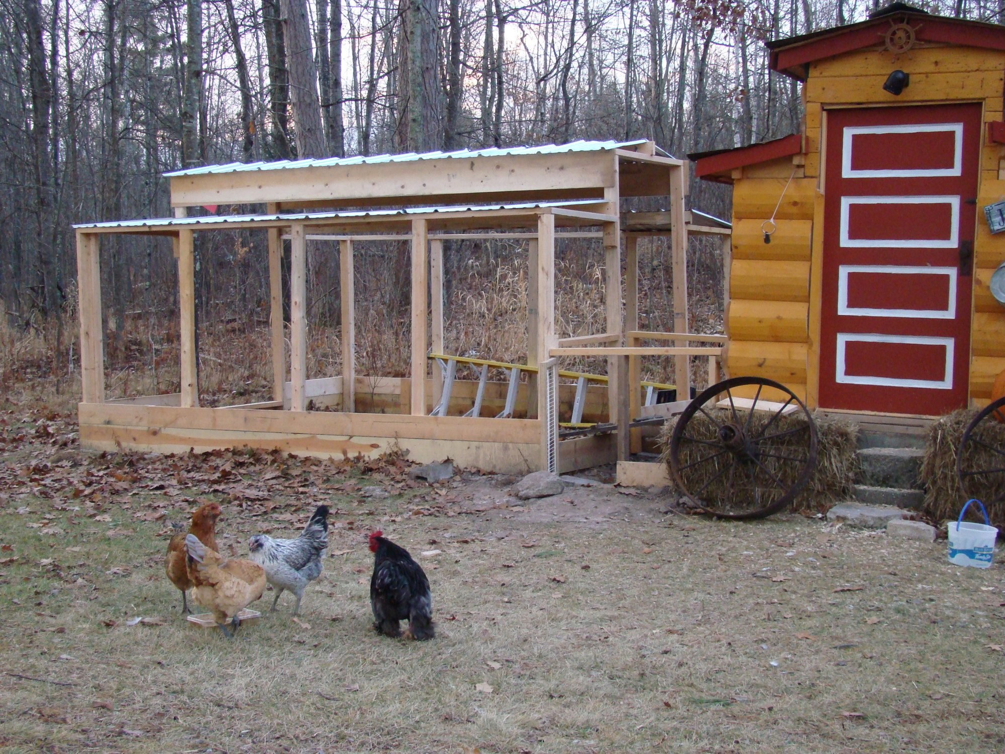 Hi LadyCluck: How ya doing? This is Bogtown Chick's Run. LOL. SHE built it for her Northern MN Winters. Works like a charm when I put Plastic up with Nail and Lath on the prevailing wind sides -- North and West. I leave partial openings on the East and South and there is a narrow section above that is open all around. More Ventilation in the Run if you Will. I put in lots of cozy hay to keep feet off frozen mud. Provide roosting in the run to warm toes.