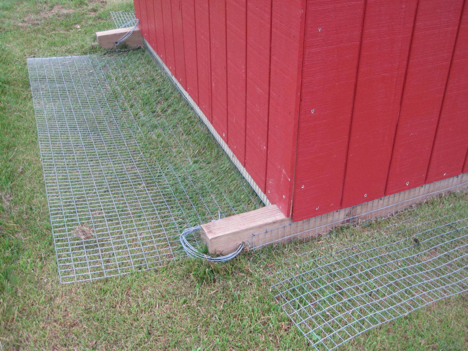 So there is a 4 inch leg bent along the house side into a L shape.....it is tacked to the runners with fence steeples.......not staples....steeples. The runners are the same as what could be the wood base of a run. The fall is then laid out on the ground and staked down. Since mine was laid out over grass, I got out the lawnmower and scalped it down to 1 inch, and laid the wire on that. Part was on bare ground where my compost bin used to sit.