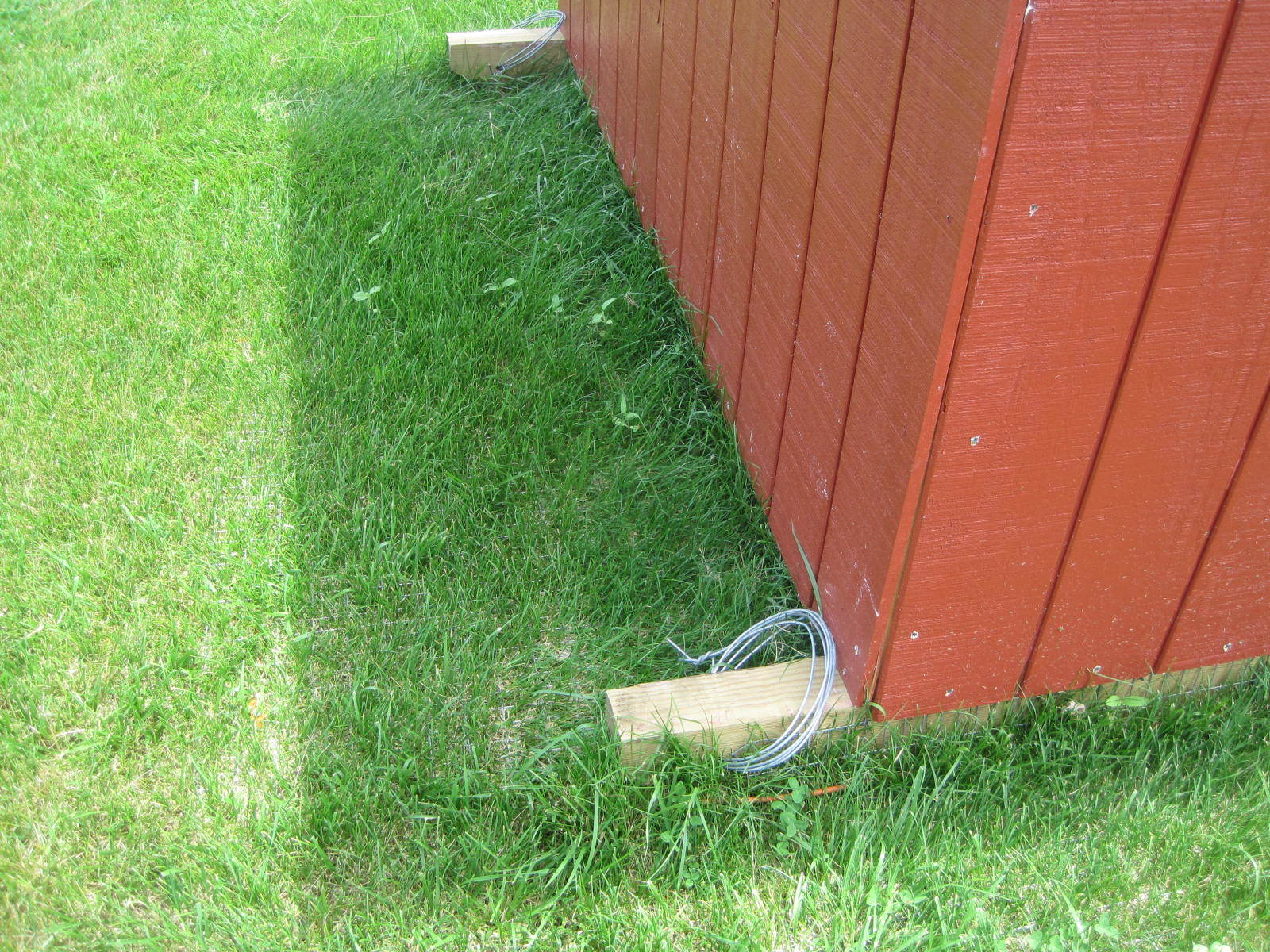 To hold the wire down along the edges, I used 99 cent tent stakes I got from Walmart......basically large nails with a perfectly shaped plastic head, to hold them down. That holds the wire aprons tight to the ground and I can then mow over them. After 2 weeks or so, the grass has grown up enough you can hardly tell the wire is there. A digger will know when he tries to get past it.