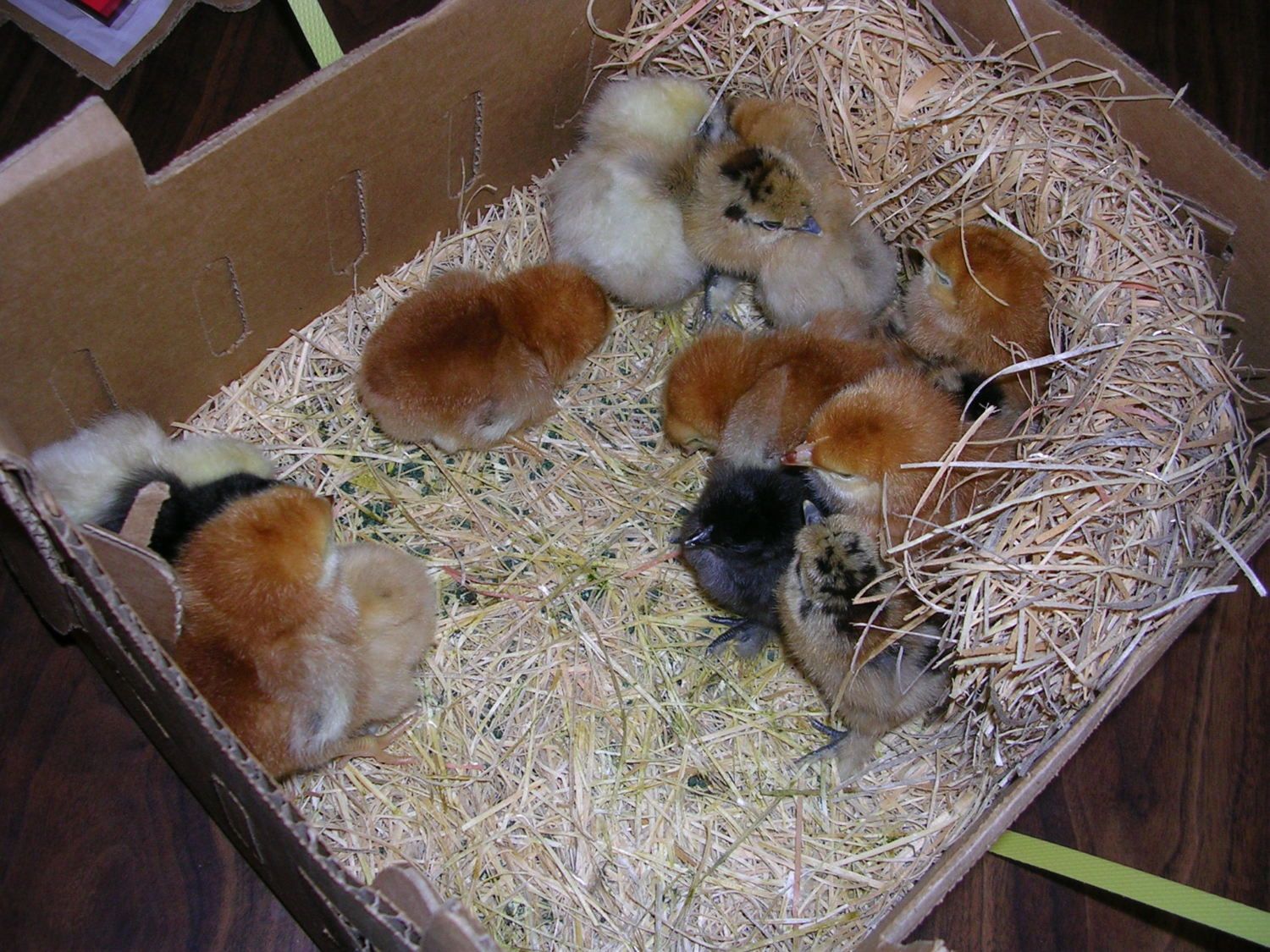 I got my call for my order from Ideal seriously minutes after walking away from the computer. So I had to jump back on for a sec and show off some more chicks. This time I got 8 silkies ( 2 black, 2 white, 2 partridge, and 2 buff) plus 6 peanus all brownish orange.
