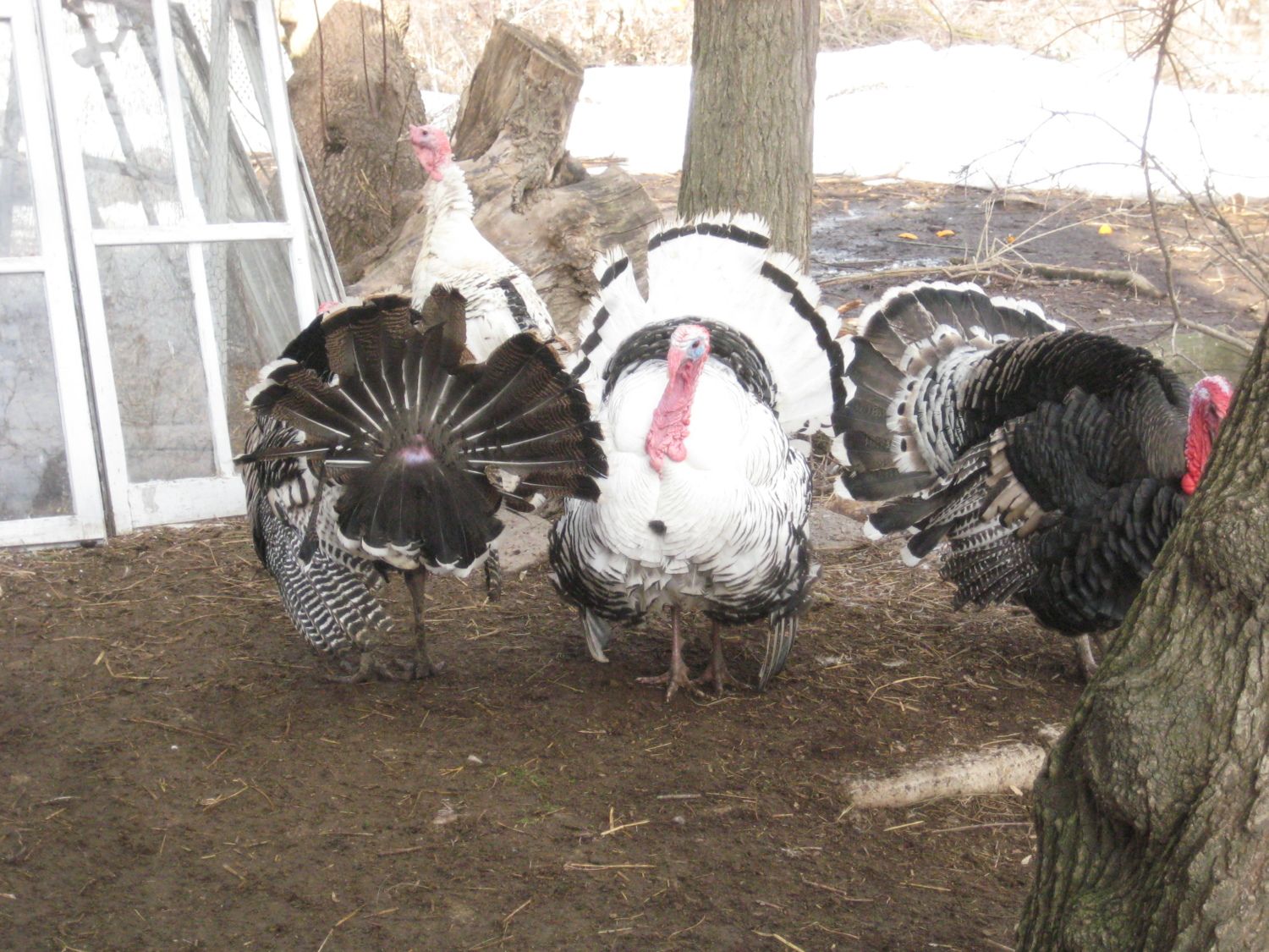 Found a pic of the three amigos...I sold the Royal Palm in the back. THis pic was from last winter...the turkeys have filled out considerably! I cant believe how mus bigger they are now. I will have to see if I can get a recent pic today. They always fan right when I come out...cause they know I am going to let the hen out--she is the only one with brains enough to sleep inside! LOL--T