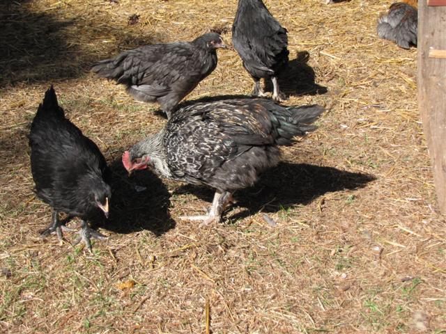 Black pullets, a "mossy" blue pullet and that same roo