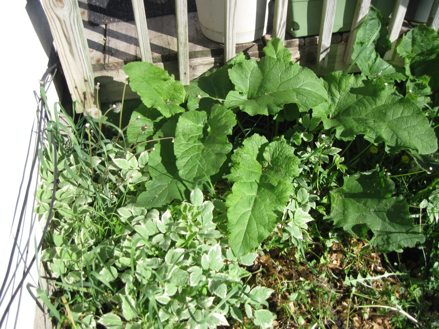 MLH---the big leaf is burdock. Use a shovel and hack it out. Dont let it go to seed or you will have it everywhere. It is an annual and if you keep at it it wont be back next year (at least in that place) The root is edible--though I have never tried it!