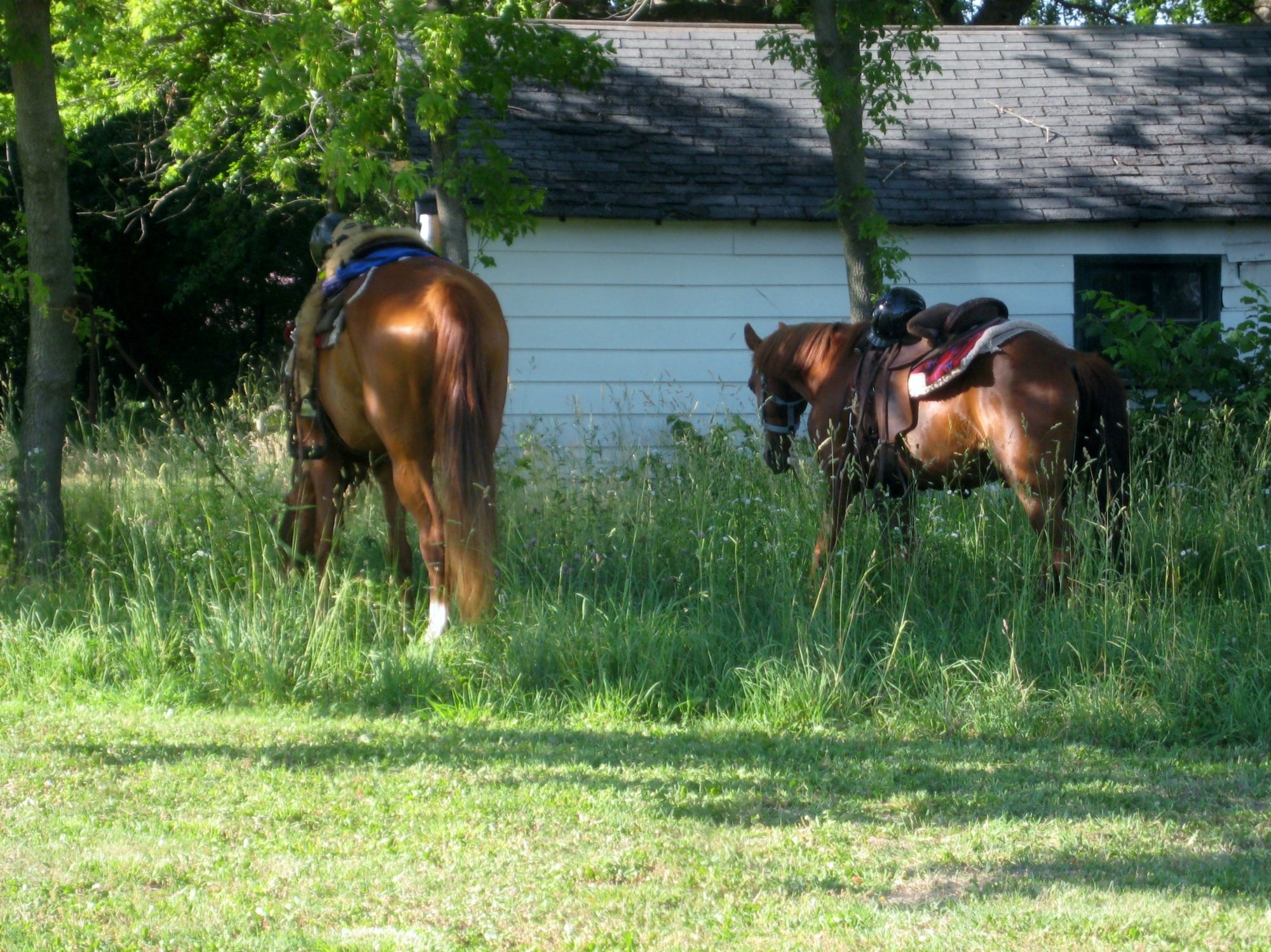 Here are the boys tied at the treeline. We stopped after our ride to have a Fish Fry at the bar. THis is how the horses looked just befor Brodie broke the tie twine. The folks in the bar were totally panicked but we went out and retied him with a much shorter rope! He had no choice but to stand then! So the FFF was delicious as usual. I saw a bunch of folks I havent talked to in a while. Very nice time had by all. THanks again MLH!