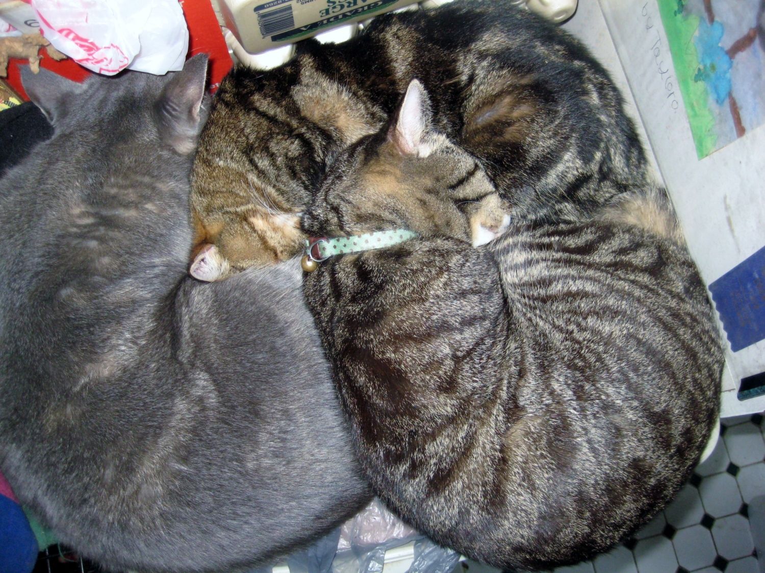 Of course by the time I fetched the camera they had shifted! The one with the colar had one of his white paws around the grey one's neck. It was so cute. THe gray (Squirrel) is hanging precariously on the edge of the pile; all 3 of them are squeezed into an empty cat box with a towel in it. Be nice if they would sleep on the gigantic cat tree in the LR.