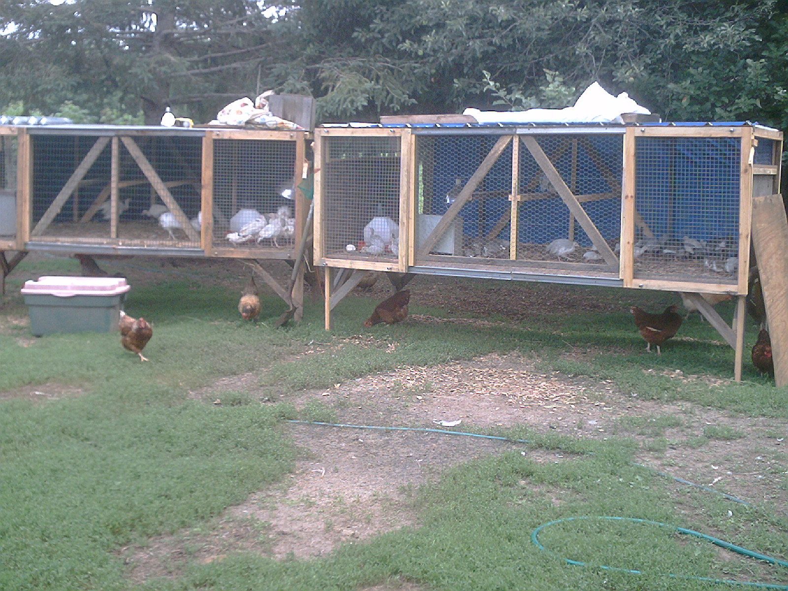 currently I have 3 peafowl, about 12 guineas and a couple of young turkeys in the left one,, and a hen with 3 half grown chicks in the right one.