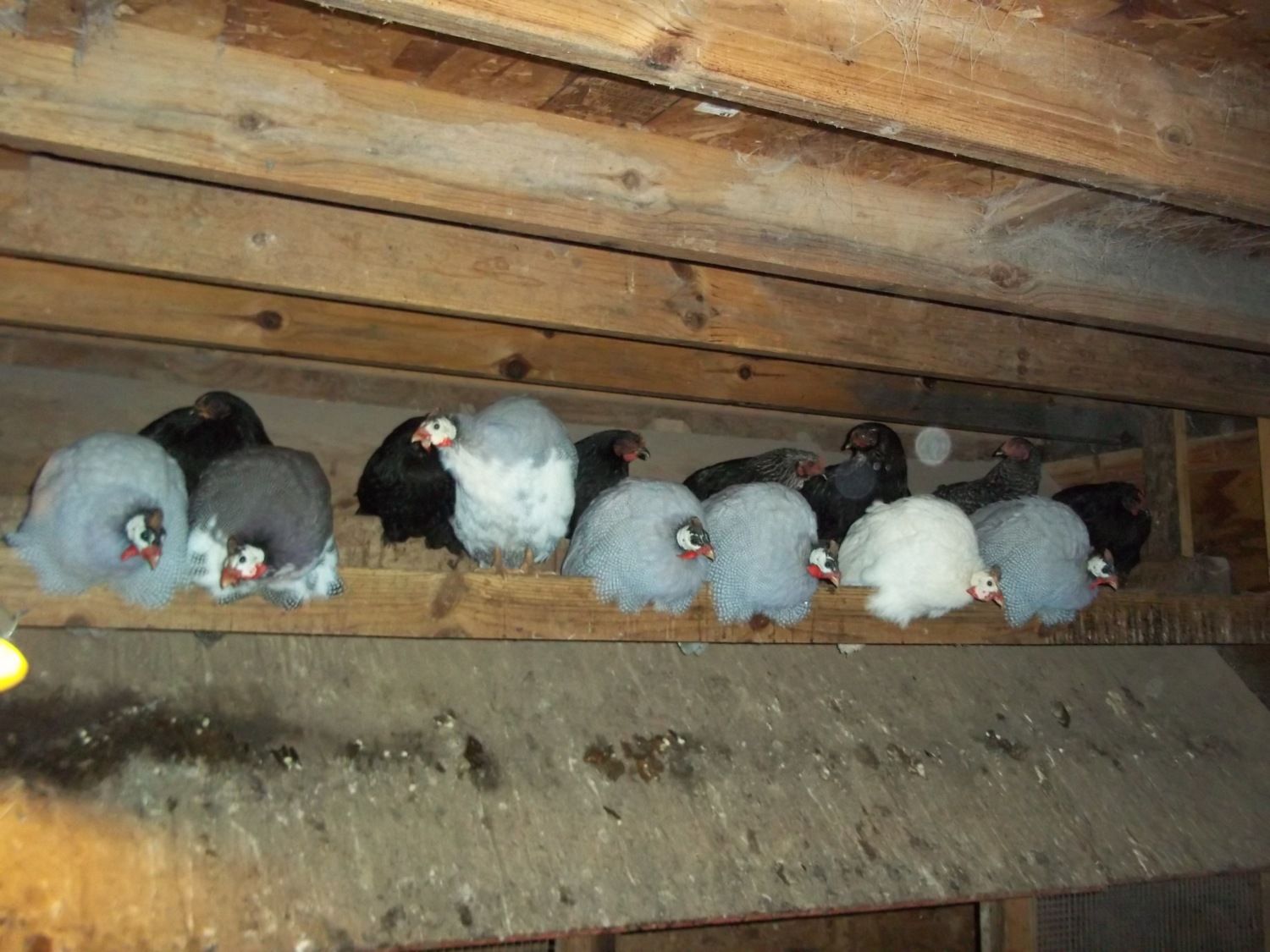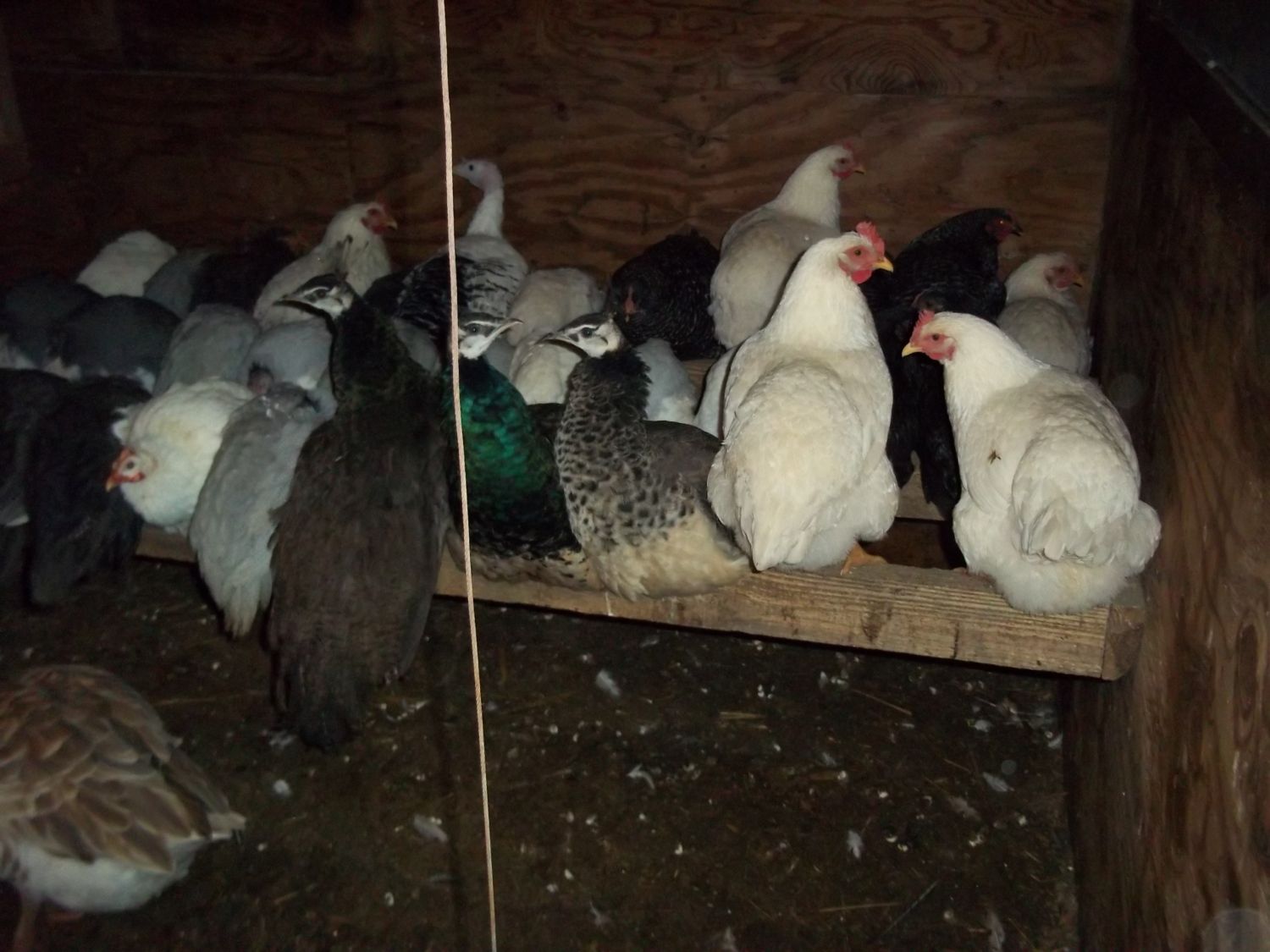 the others are on three roosts along the North wall.. they are the young guineas, pullets and three baby peafowl..