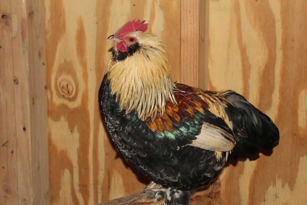 Here is one of the roosters I am trying to get rid of. I had someone out to butcher all my extra bantam roosters the other day and he got away and hid under the coop. Bantam salmon faverolles x lemon blue cochin