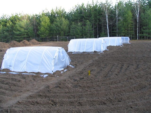 here's a pic from a few years ago when I used them for starting my giant pumpkins in April. You can use large document binder clips for holding end walls, these are 1/2"pvc on a 5'X8' base, there is a center ridge support that the bows are attached to with zip-ties,,,these huts were also anchored down in the field with strapping over the top. Wind will blow these things around like kites,,,,don't ask how I know that.