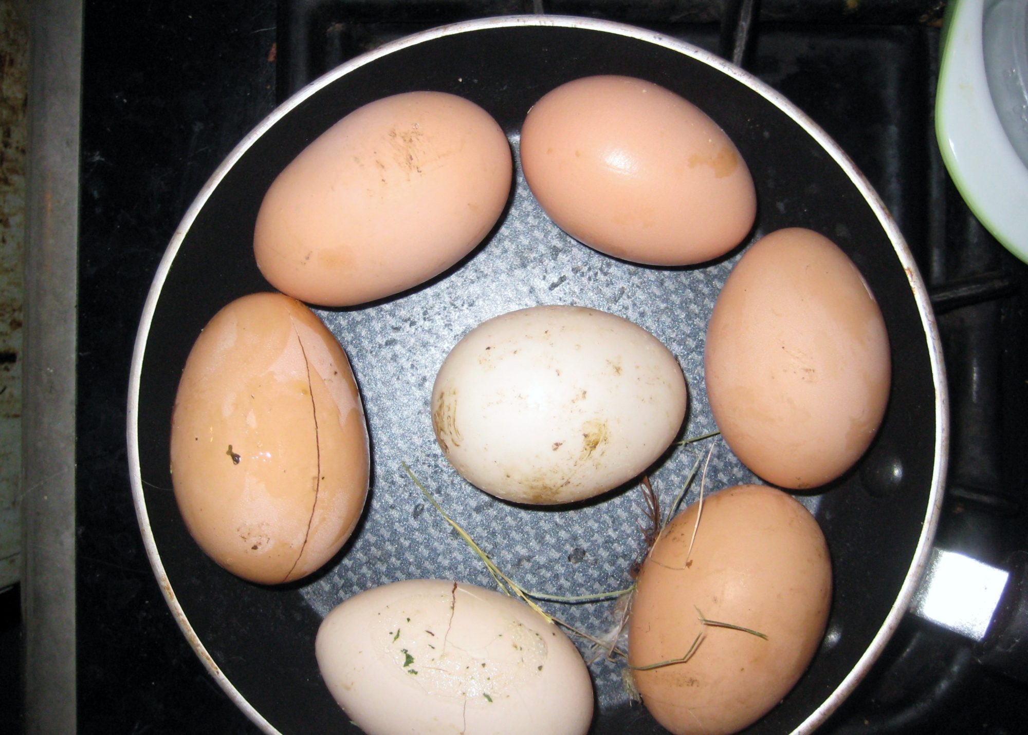 ANyhow, I took this pic of my eggs the other day. The egg in the middle of the frying pan is a muskovy duck egg.