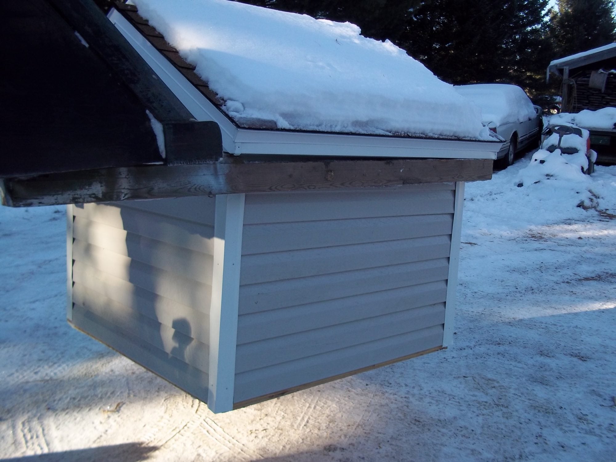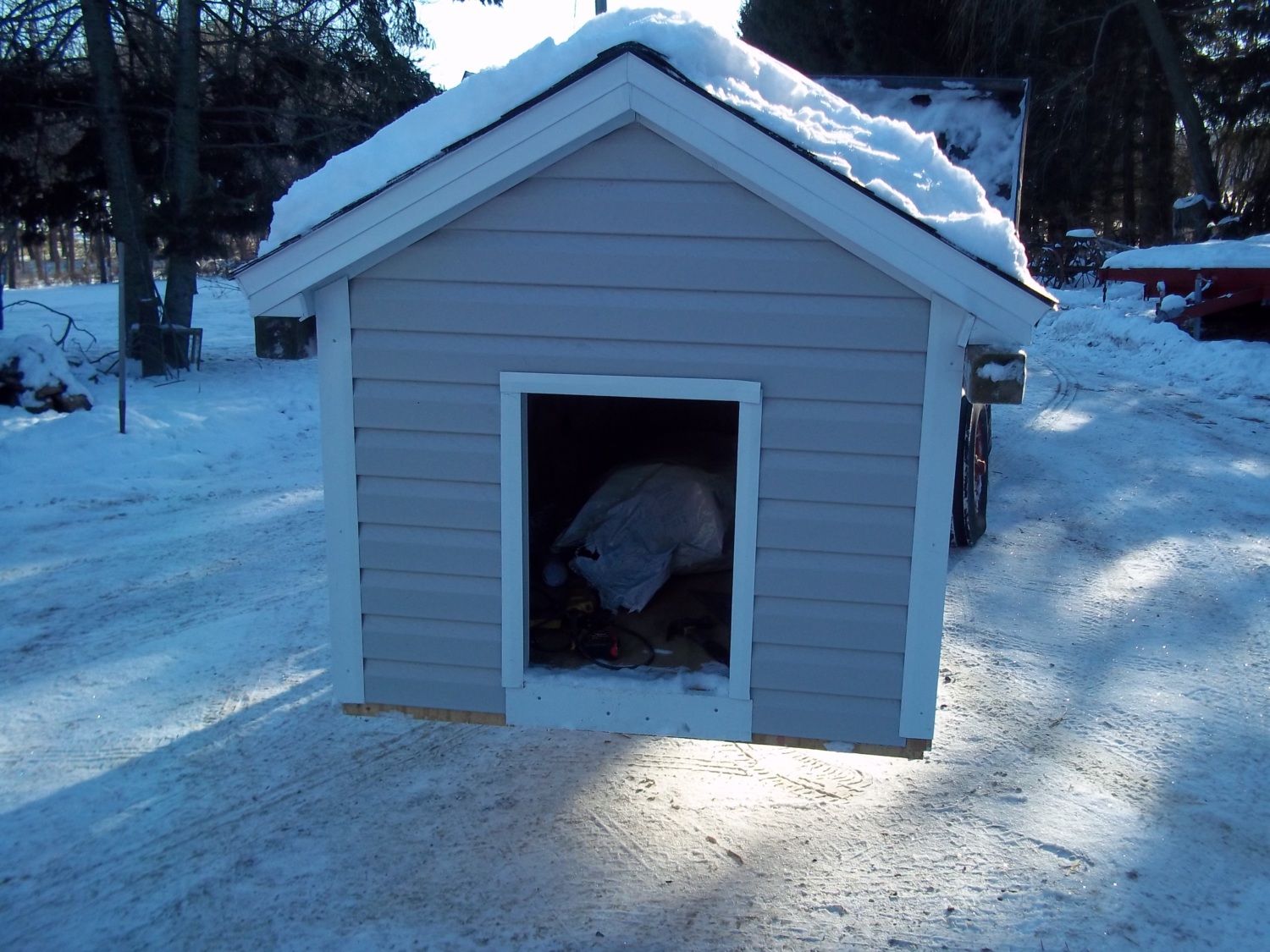 here is the dog house I just built this fall.. It is suspended from the loader on Ollie, the Oliver tractor.. I designed it so that the eaves are strong enough for it to be lifted thus..