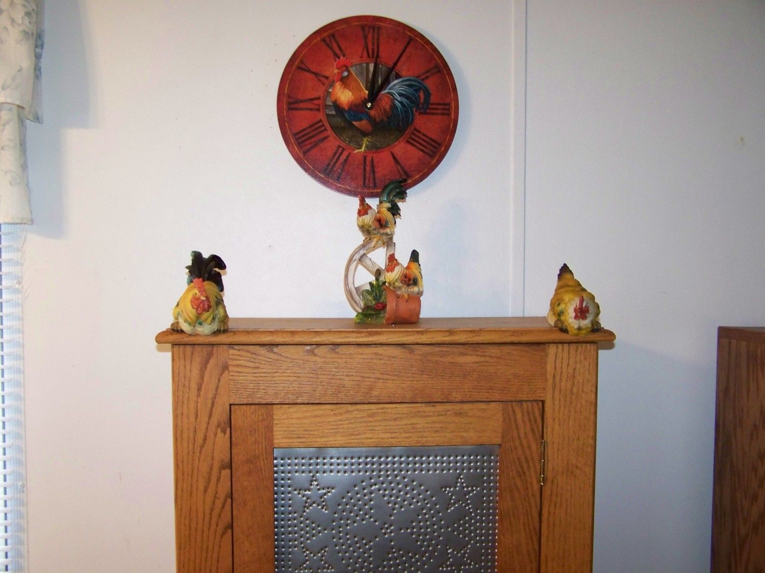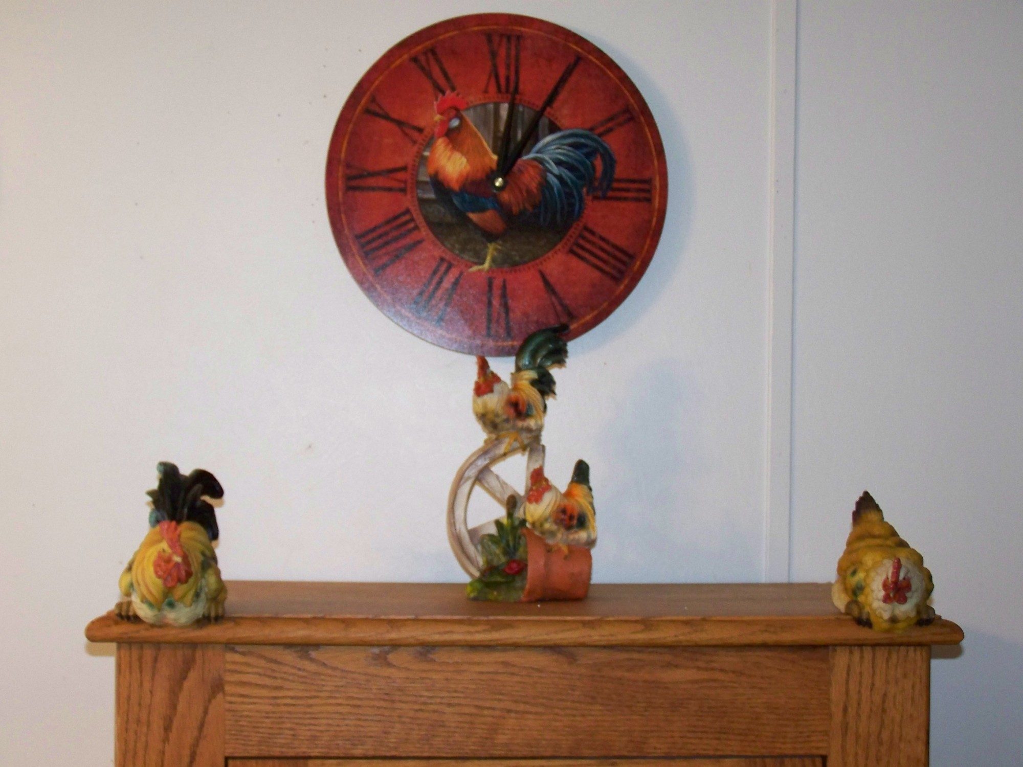 This is a set of shelf sitters I picked up @ 30% off (the little statue too) so the entire grouping was less then $15. I had to have something to go with the Rooster clock from Amazon hubby got me for Valentines Day (love it when he lets me pick out